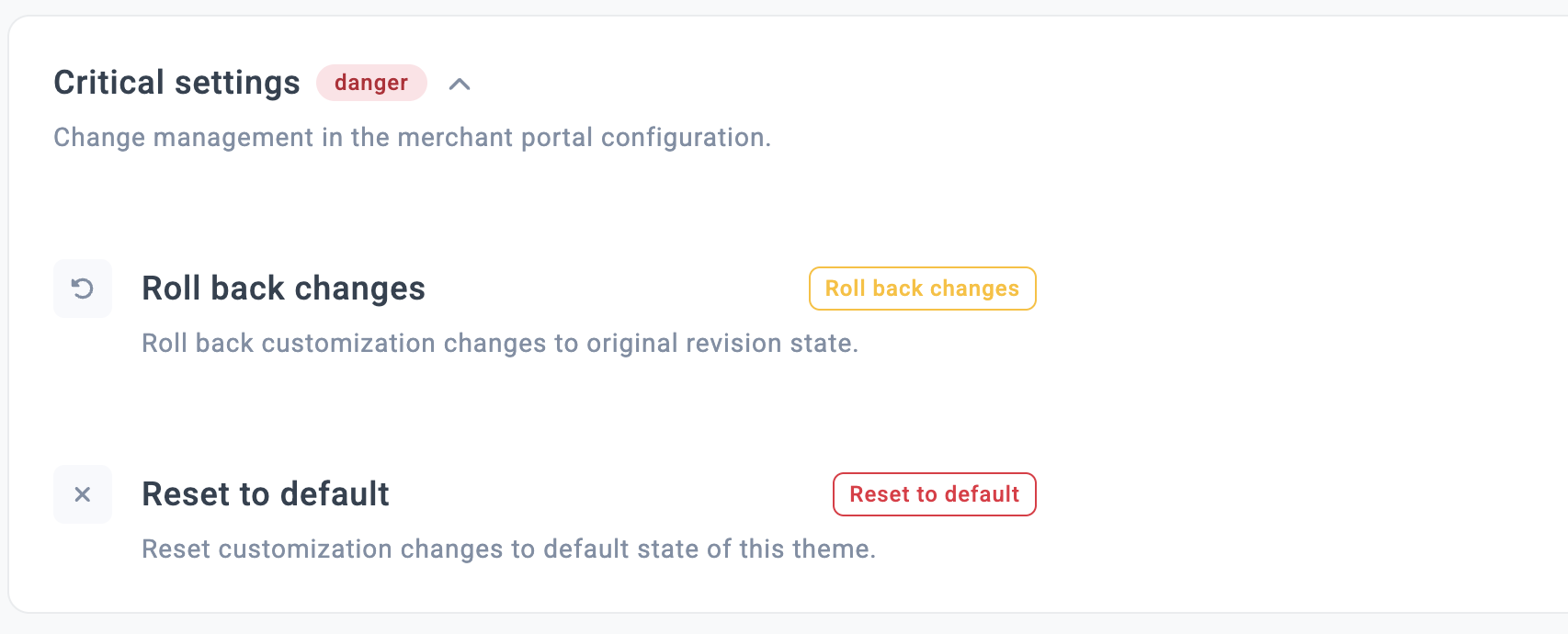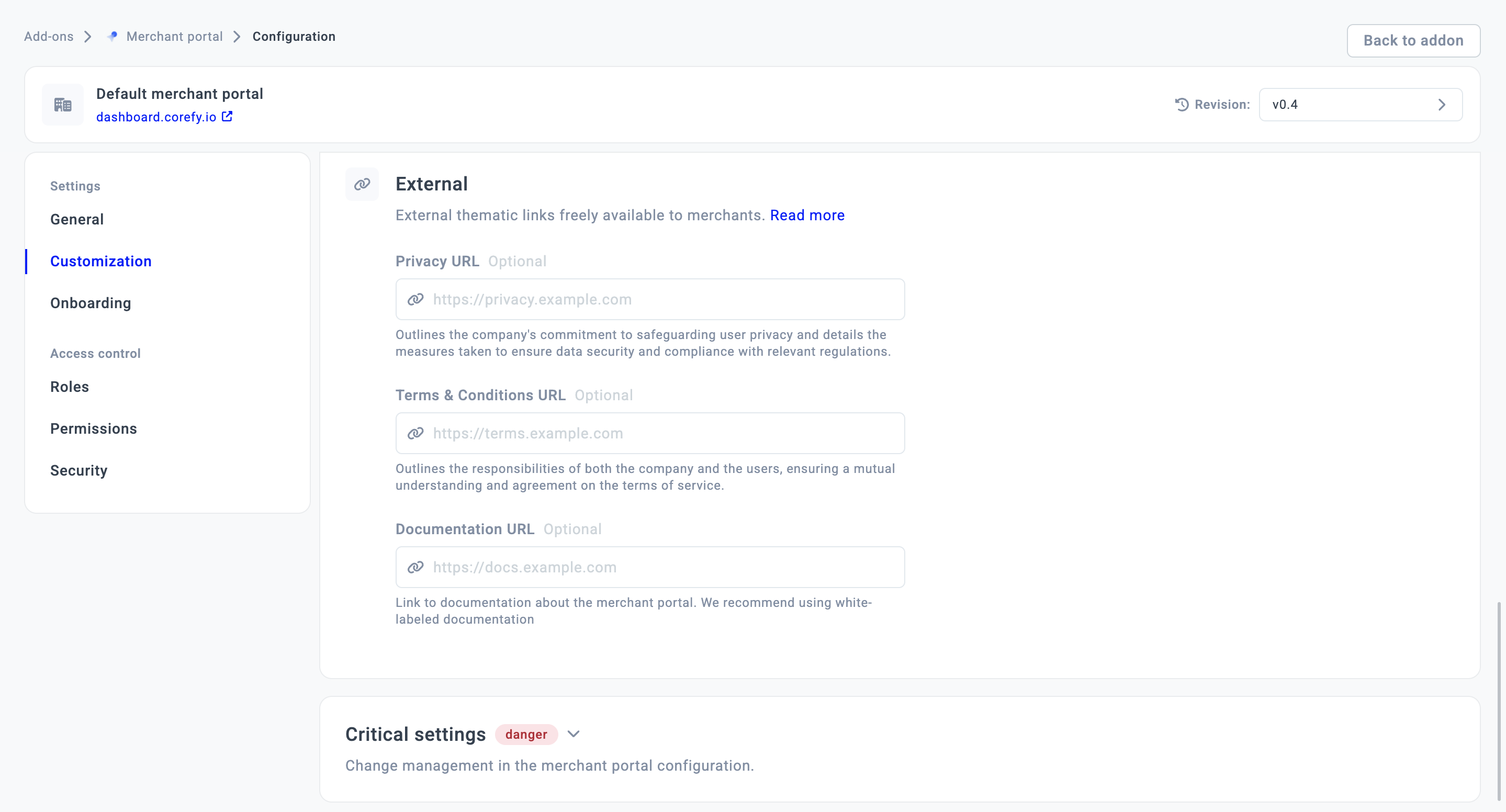 The External settings comprise a set of specific URLs that you can provide, which should be available to all your Merchants.