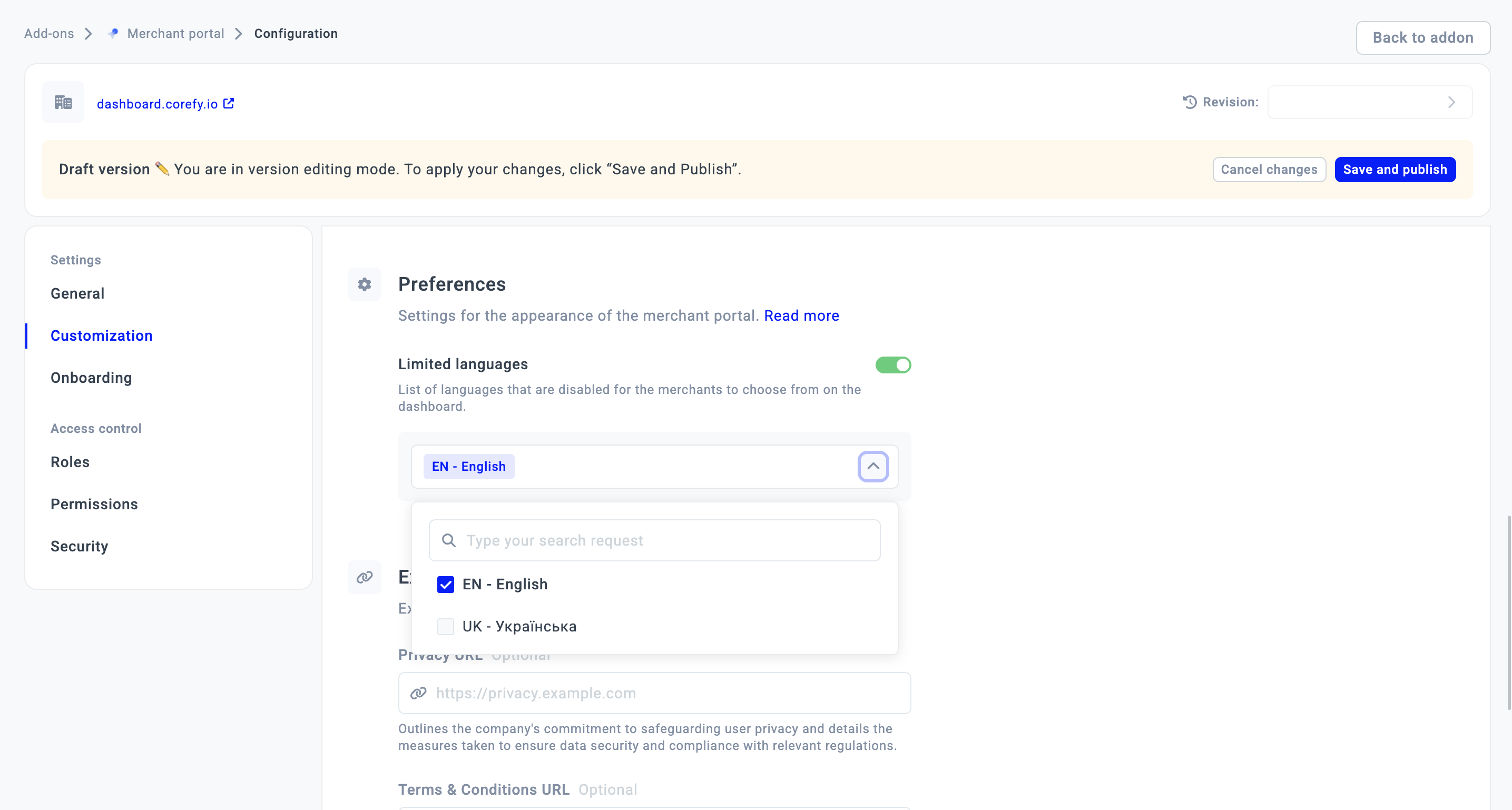 - Then, select the languages you want to limit for your Merchants from the respective combo box.