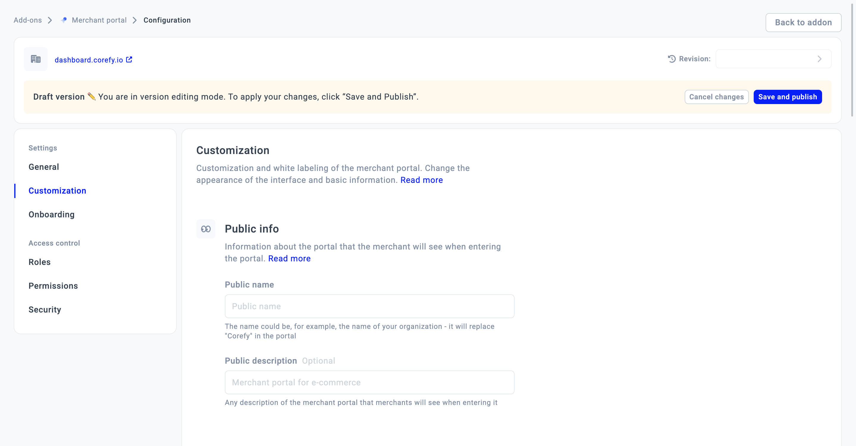 - To add a Public name, enter the relevant data into the respective text field. Your Public name replaces Corefy in the Portal.