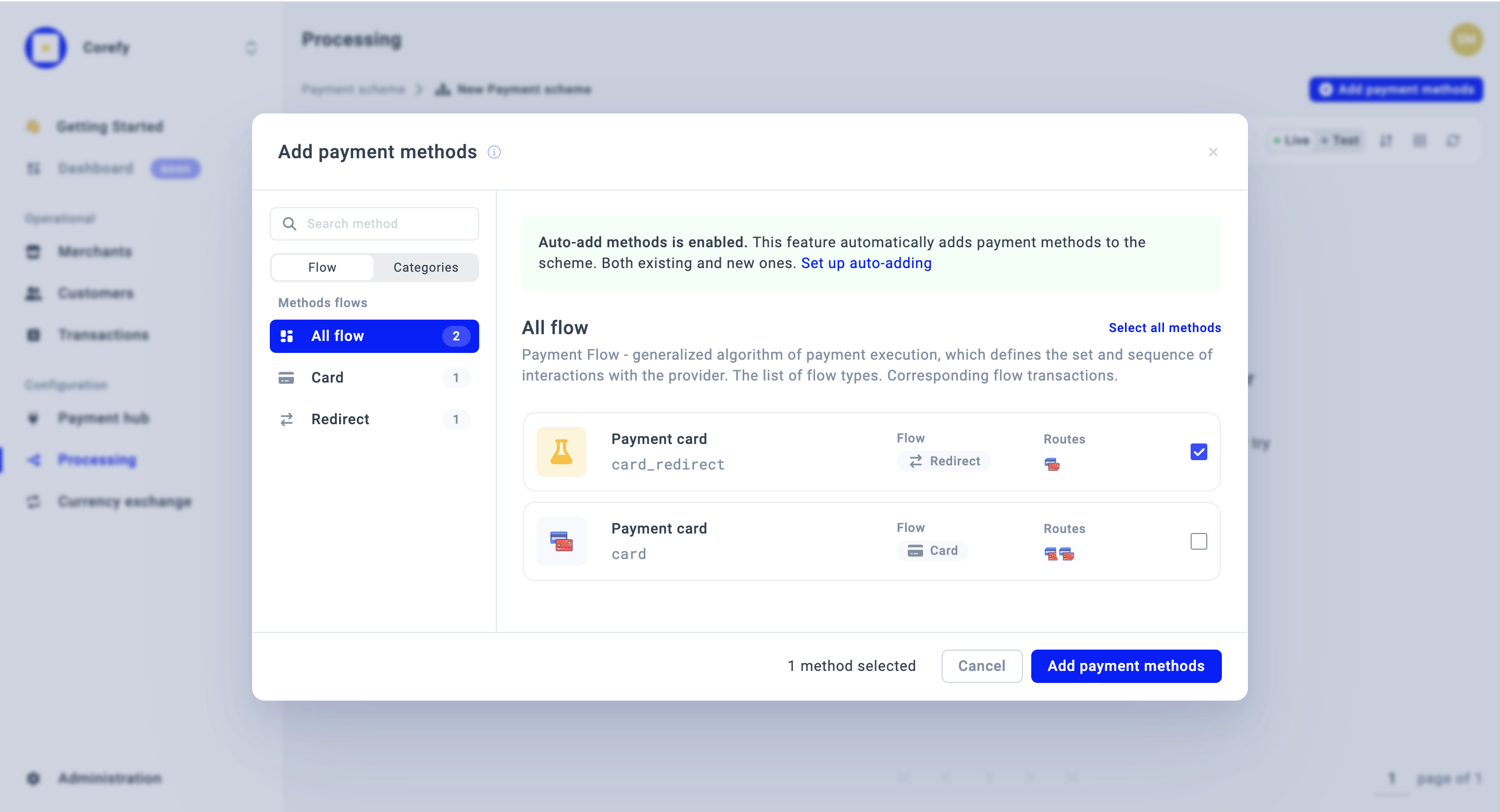 - Navigate to the Payment methods tab of the specific Payment scheme and click Add Payment methods to add a Method manually.