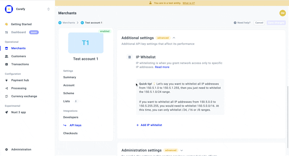 - Scroll to the Additional settings block. It includes the functionality to set up the IP whitelist ranges.