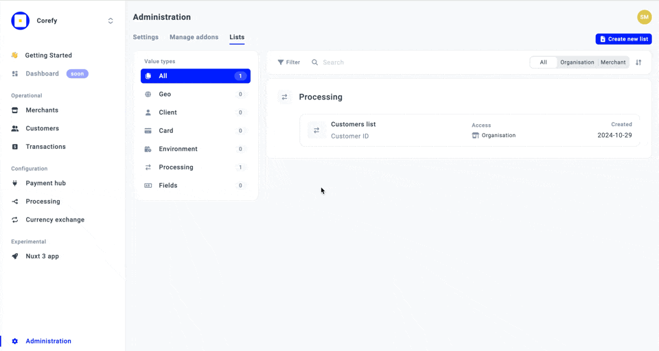 - Choose who can access the list. Click Whole Organisation to grant access to its every Member. To enable limited access, click Merchant and select the Merchant account in the combo box below. Click Create a List.