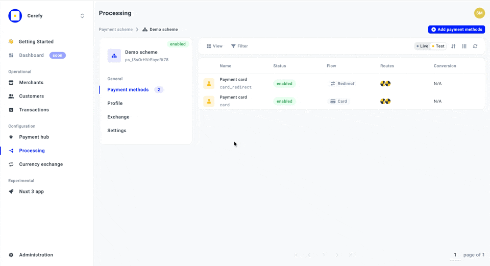 - Navigate to the Payment methods tab of the specific Payment scheme and click the particular Method on the grid.