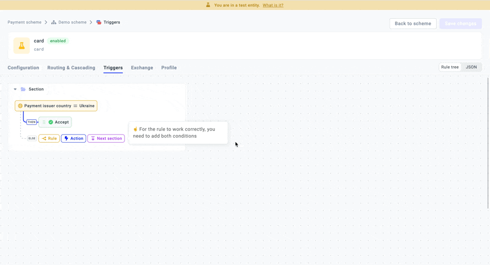 While dealing with Routing, you can set additional conditions or restrictions that should determine the transaction status and distribution. The Trigger scheme, just like the Routing tree, can contain a set of specific Rules and Actions brought together to establish the correct payment functioning and workflow. When the Trigger conditions are met, the system initiates the Routing process and allocates the payments to the corresponding Routes.