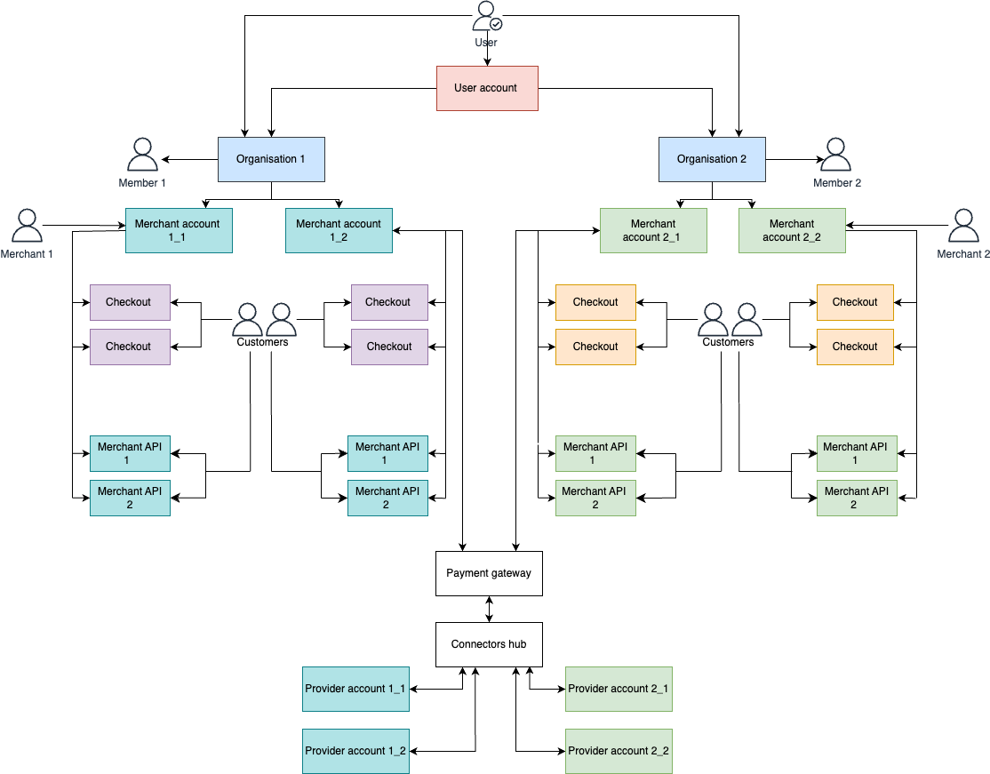Organisation is an element in our structure related to a particular business case. On the Organisation level, users become Members and perform specific Roles based on the permissions. The Owner of the Organisation is a user who primarily created it in the system. One Organisation involves multiple Merchant accounts. To learn more about the Organisation, go to Organisation settings.