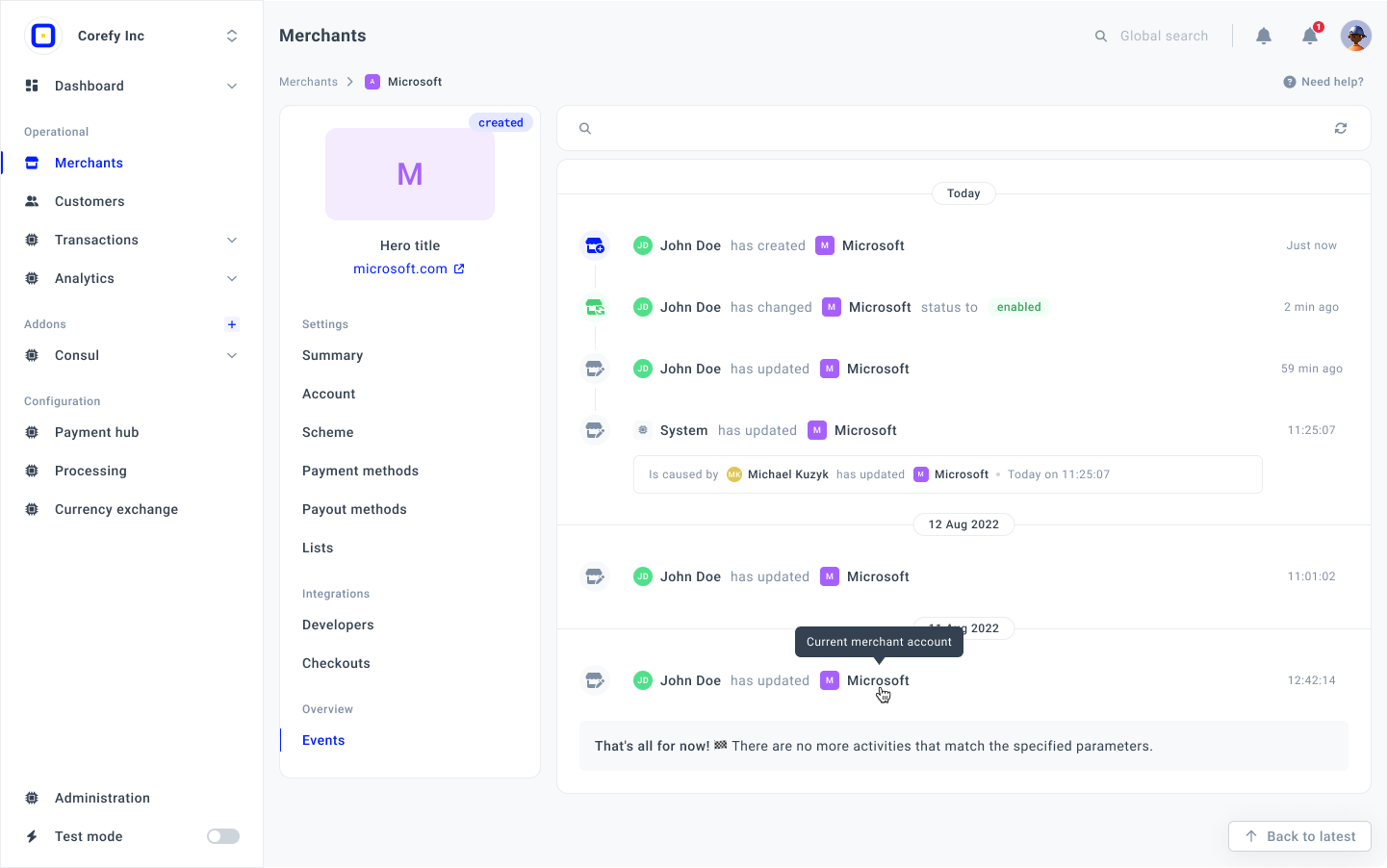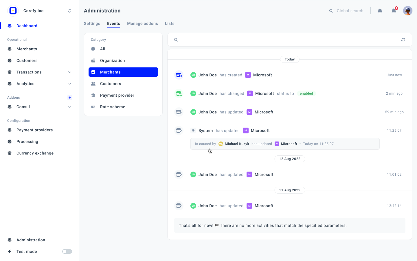 - Go to the Events tab and track all the activities you (as a particular user) perform in all the Organisations.