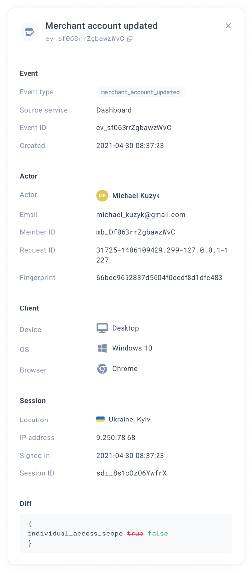 - The Event details may vary depending on which entity is chosen to track the Event and the Actor that initiated it.