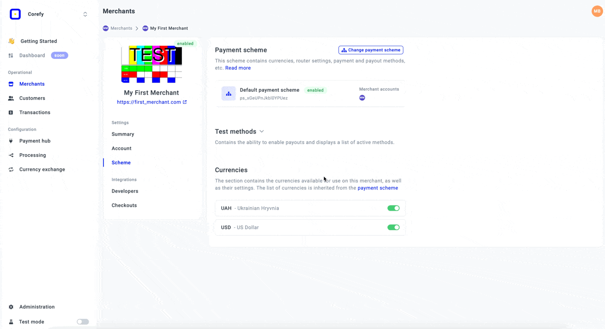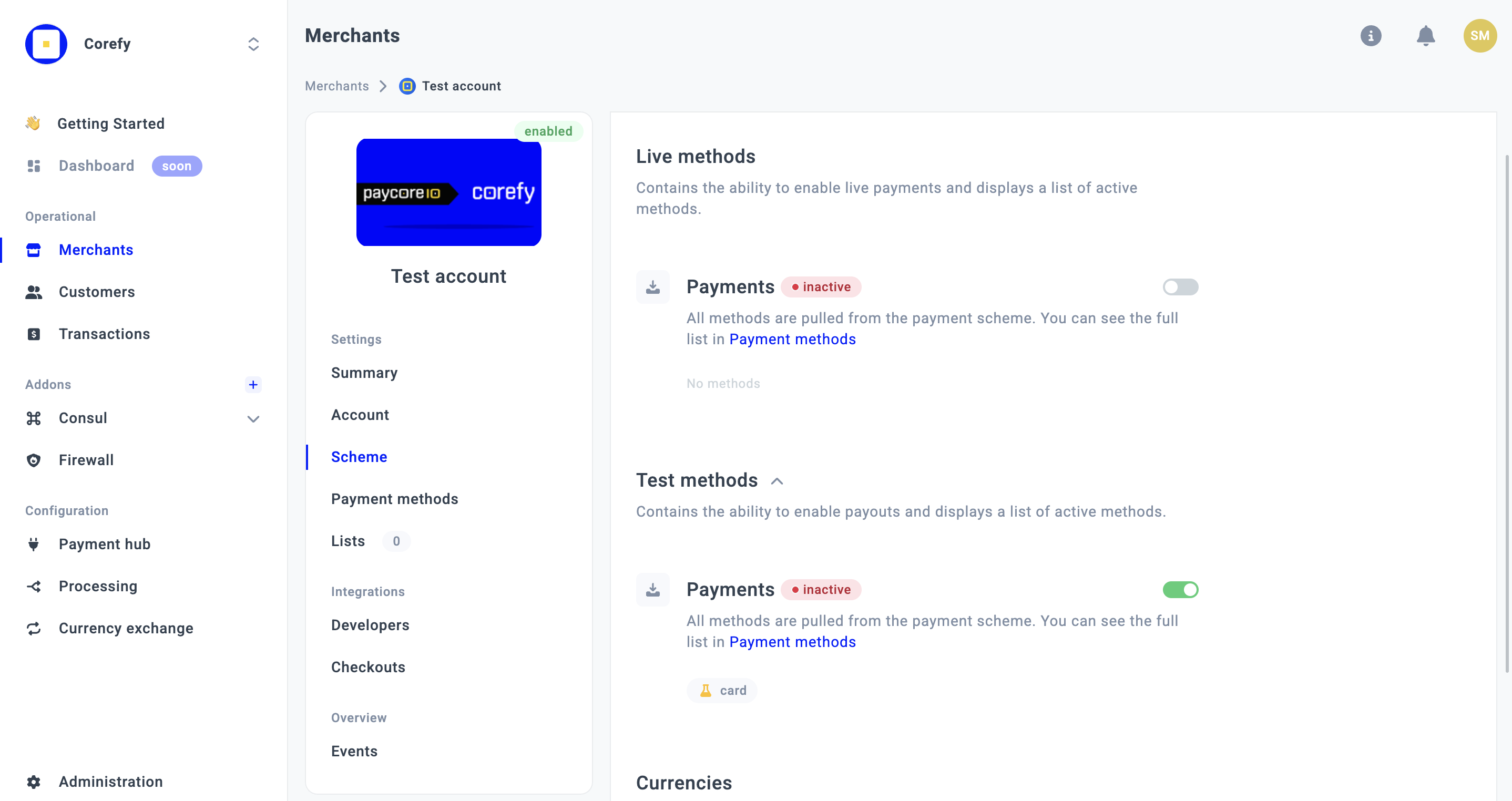 - As the Currencies are attached to the Scheme, after it changes, old Currencies remain in the Merchant account but become inactive. Vice versa, the Currencies from a new Scheme become activated.