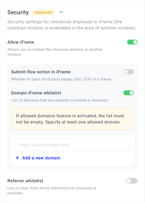 | Referrer whitelist | You can create a List of sites from which redirection to Checkout is possible by entering the Domain into the corresponding field.