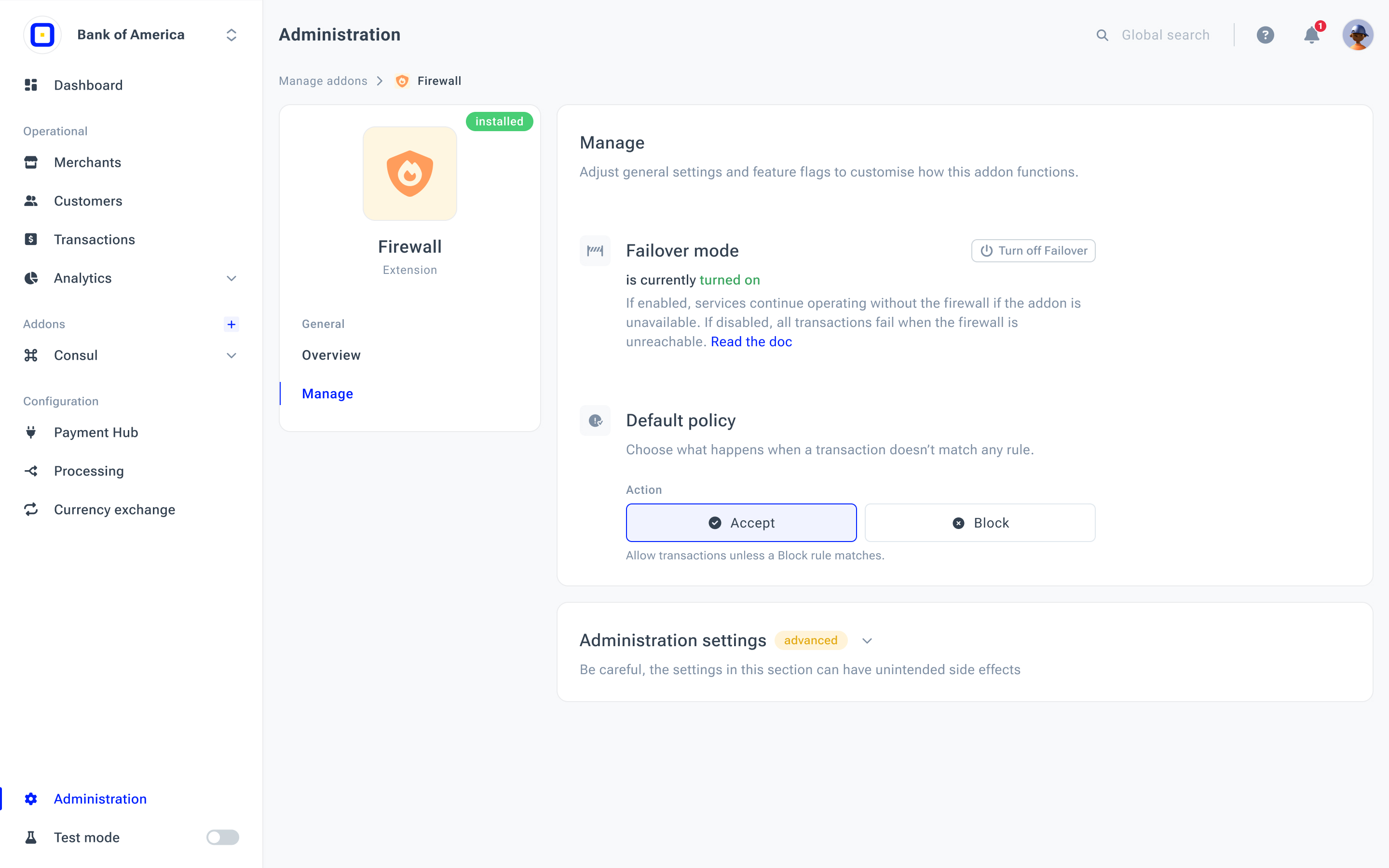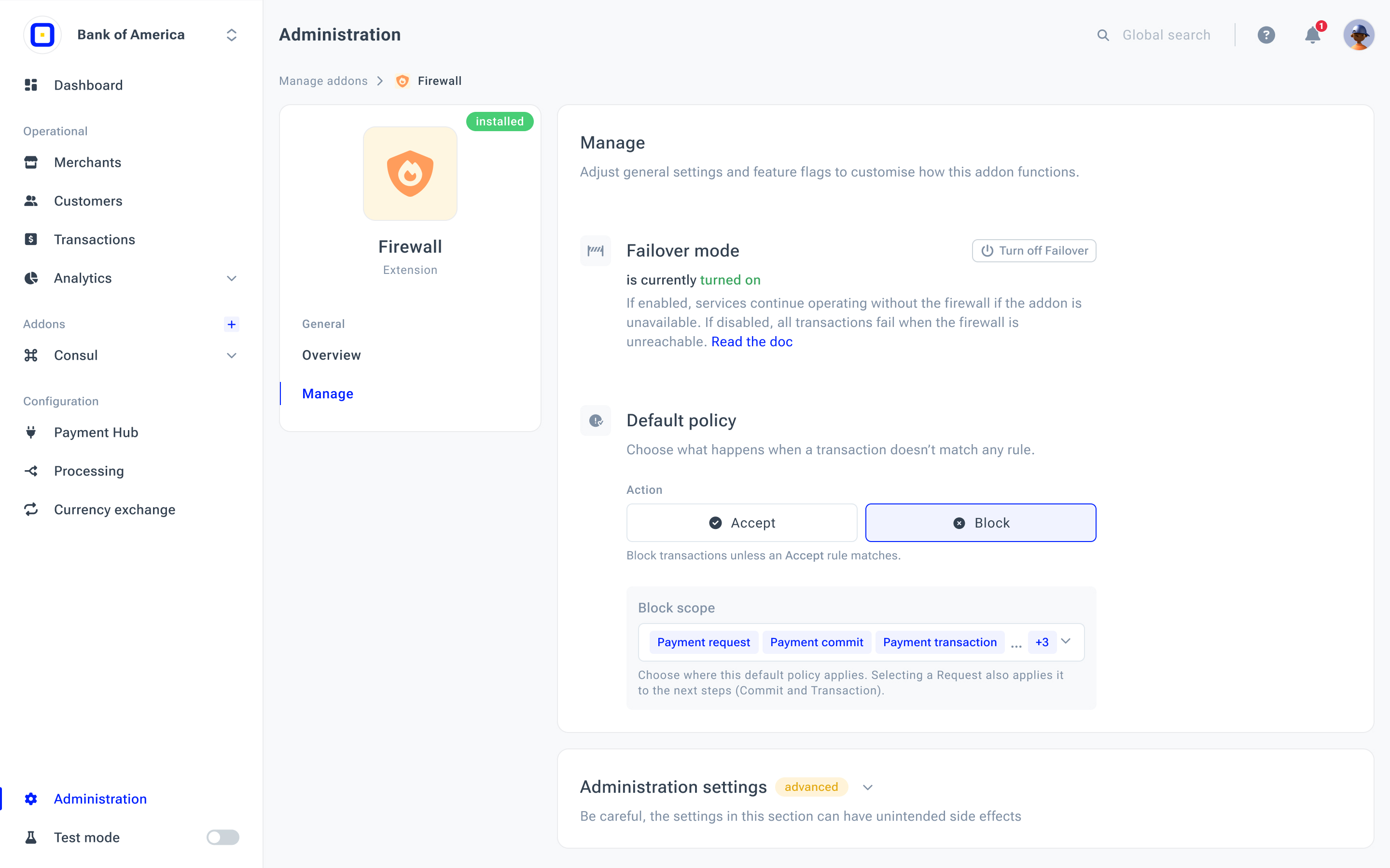 The principle: Allow transactions unless a Block rule matches. This policy follows an allow-by-default approach and is suitable when Firewall rules are primarily used to restrict specific transactions, such as those originating from specific countries, suspicious cards, or high-risk patterns. |