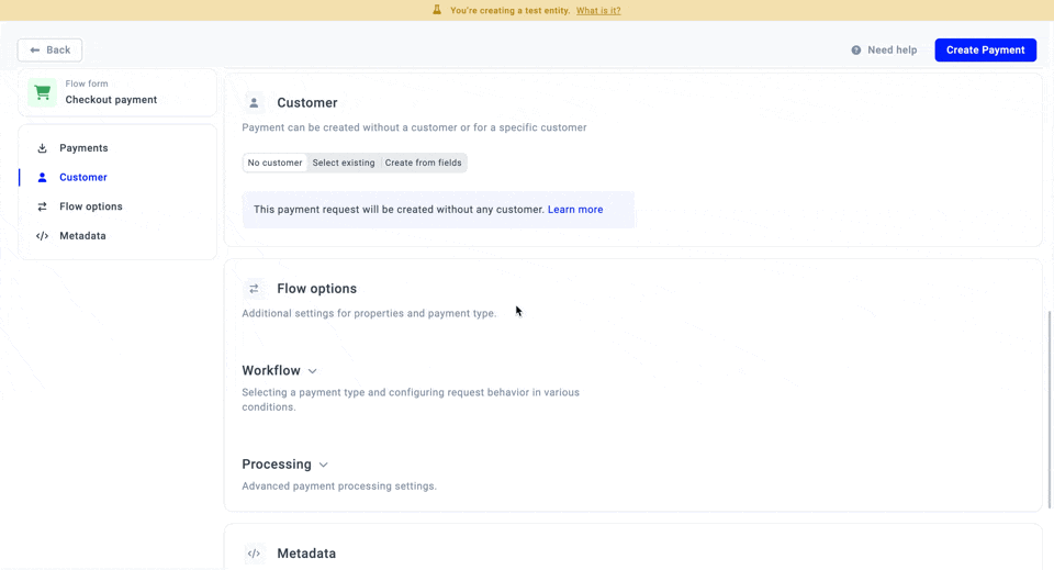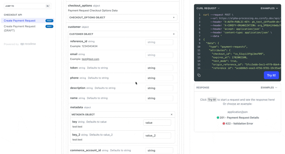 We provide you with another option to create a Customer within our system. It presupposes creating a Customer via API. Thus, we advise you to navigate to the API documentation and analyse the Create Payment Request. It includes the Customer data array and the functional preconditions required for the specific input parameters. All those parameters are singled out, structuralised and described in detail.