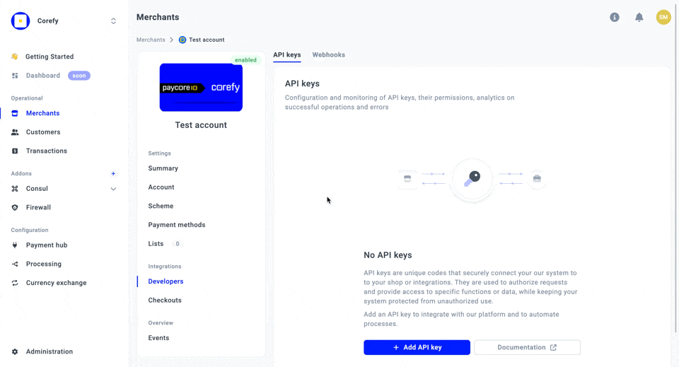- Then, navigate to the Developers tab of the specific Merchant account and click Add API key.