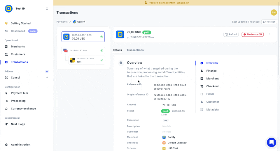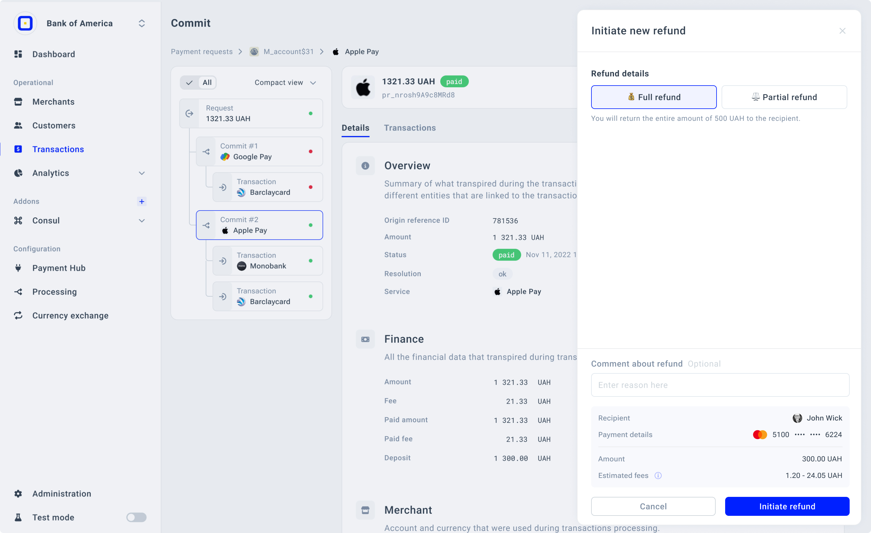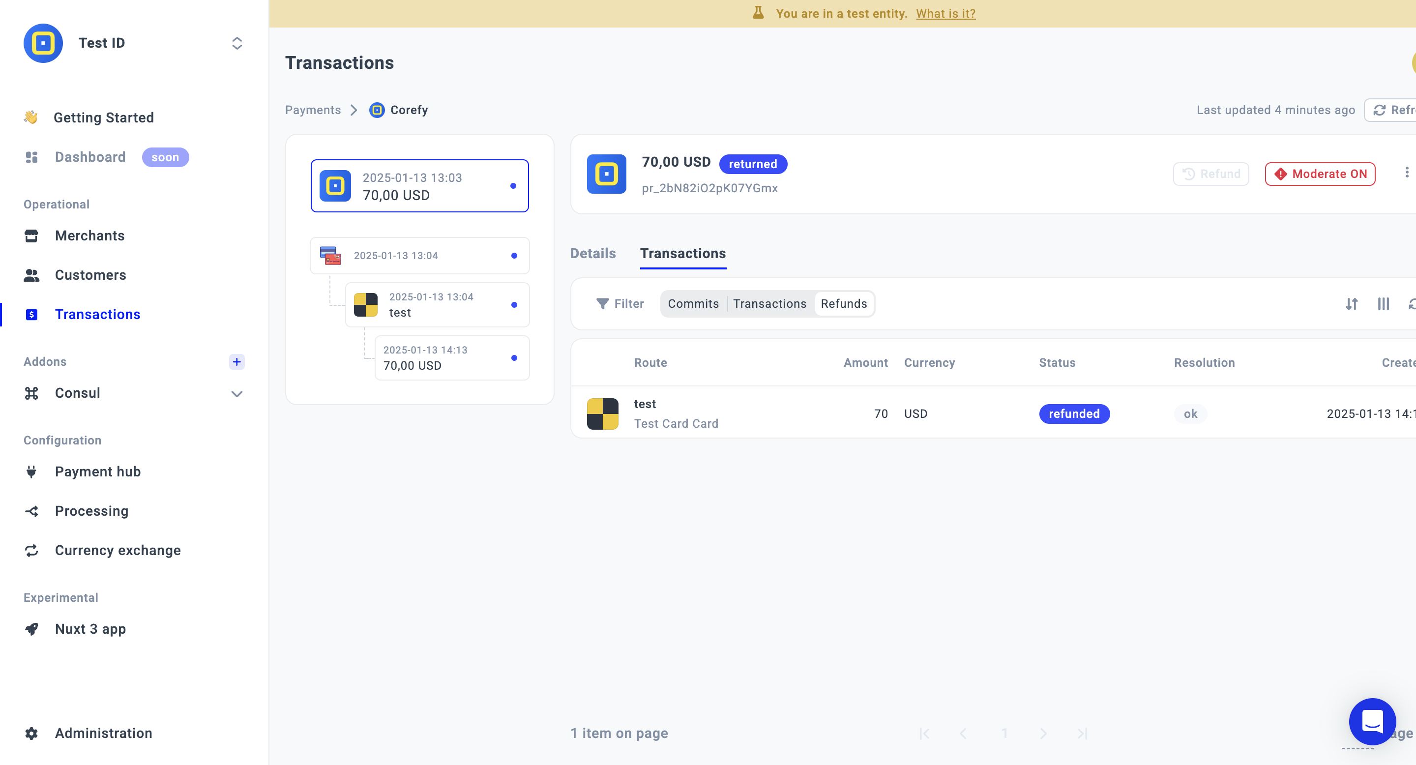 - The Refund is created and displayed under the Transaction(s) corresponding to a certain Refund level. The system shows you its Status and Resolution.