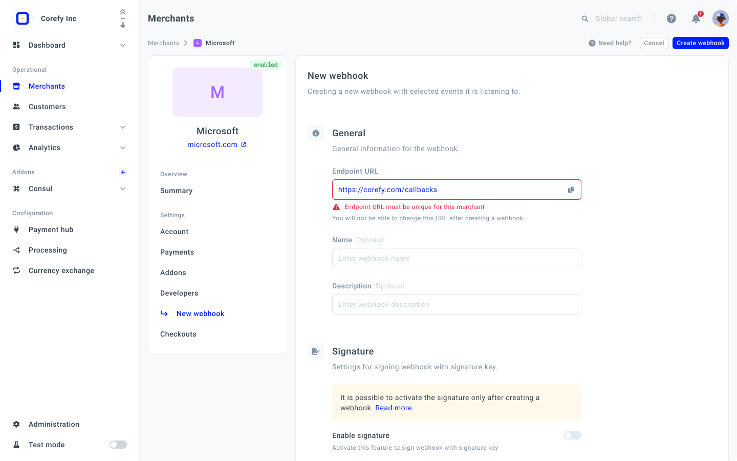 - After the Webhook creation, you can set a specific Signature for the given Webhook as an additional security measure. To learn more details, go to the Enable Signature for a Webhook guide.