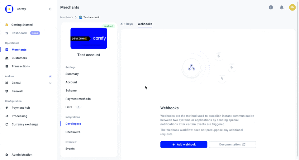 - Then, navigate to the Developers tab of the specific Merchant account and choose the Webhooks tab at the top.