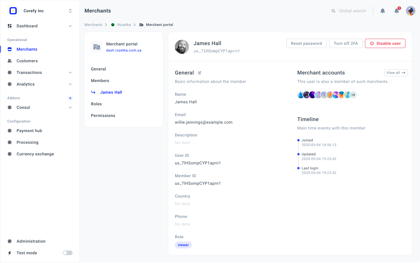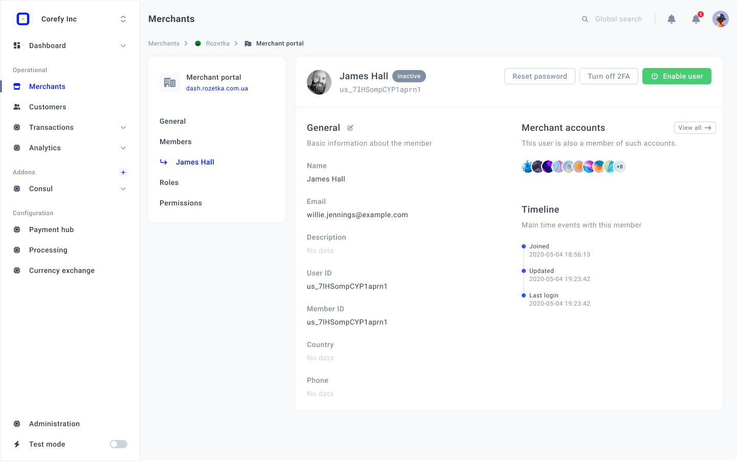 Editing Member details allows you to update information about existing users in your Merchant account, keeping it relevant for all operational processes. You can modify details such as a Member's name, Email address, or Contact information to ensure that user data remains accurate and excludes any mismatches.