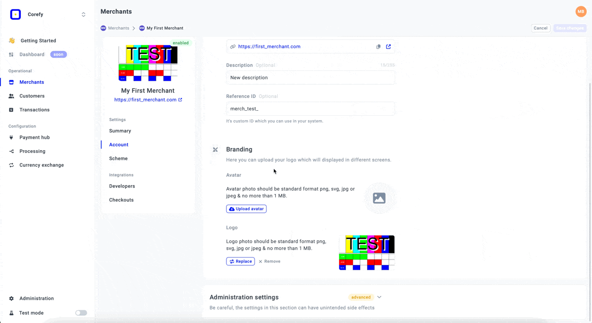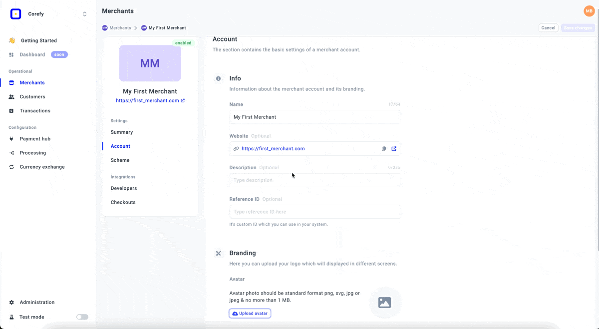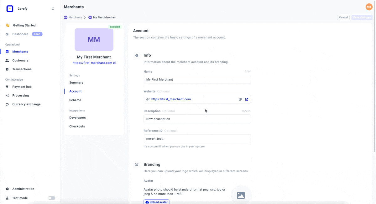 → As a Payment Service Provider, you can apply or update branding for the specific Merchant by adding a Logo or Avatar from the Dashboard. |