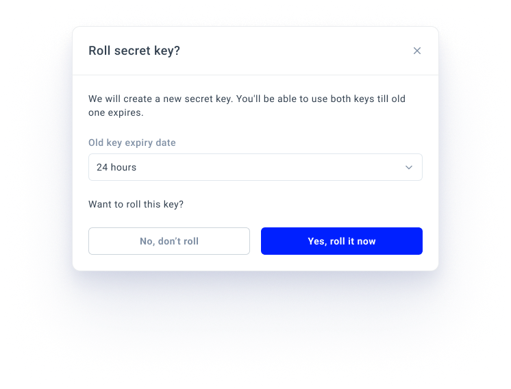 - The system opens a new modal to enable you to roll a key. It also includes the Old key expiry date dropdown list with options: 1 hour, 3 hours, 24 hours or 7 days.