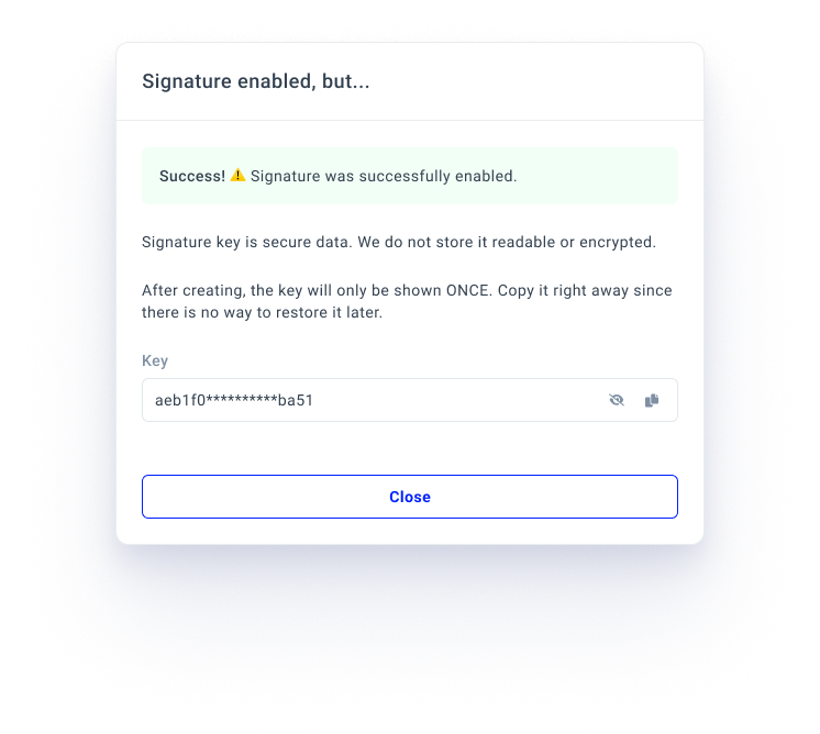 - Switch on the Enable Signature toggle. The system should initiate opening a modal and request you copy a Secret key.