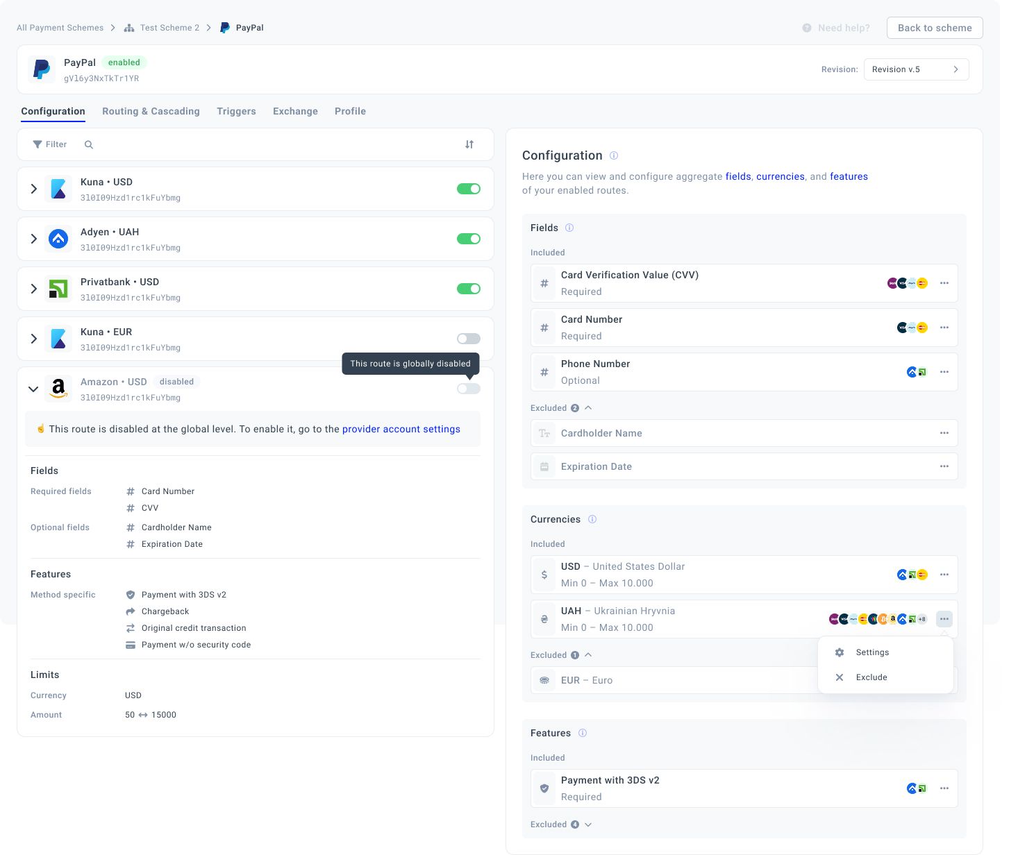 | Disabled | The Route becomes Disabled only when you switch it off in the Provider account settings. It cannot be used in processing. |