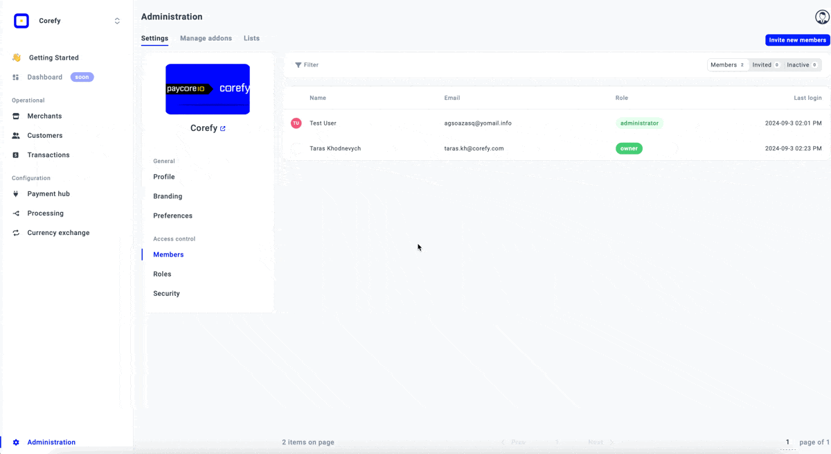 - In the Profile settings, click the Members tab and view three lists of the Members of the given Organisation. You can view all Members, including Invited and Inactive ones.