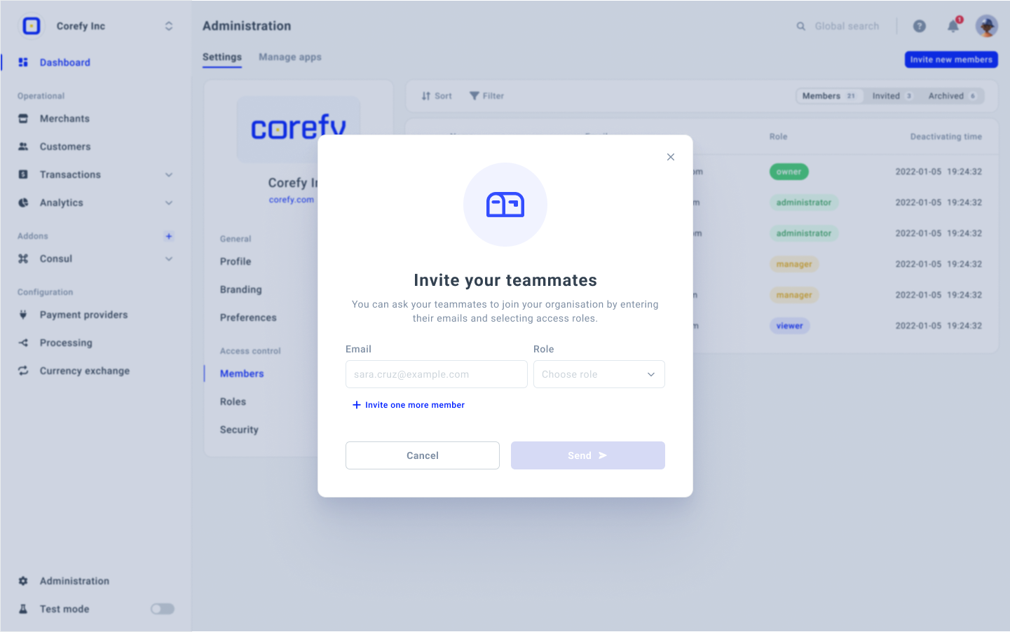 - You can invite one or multiple Members to join the Organisation. Click Invite one more member, and choose the Role for each additional Member. You can invite up to five Members at a time. But if you need to invite more people, just repeat the flow.
