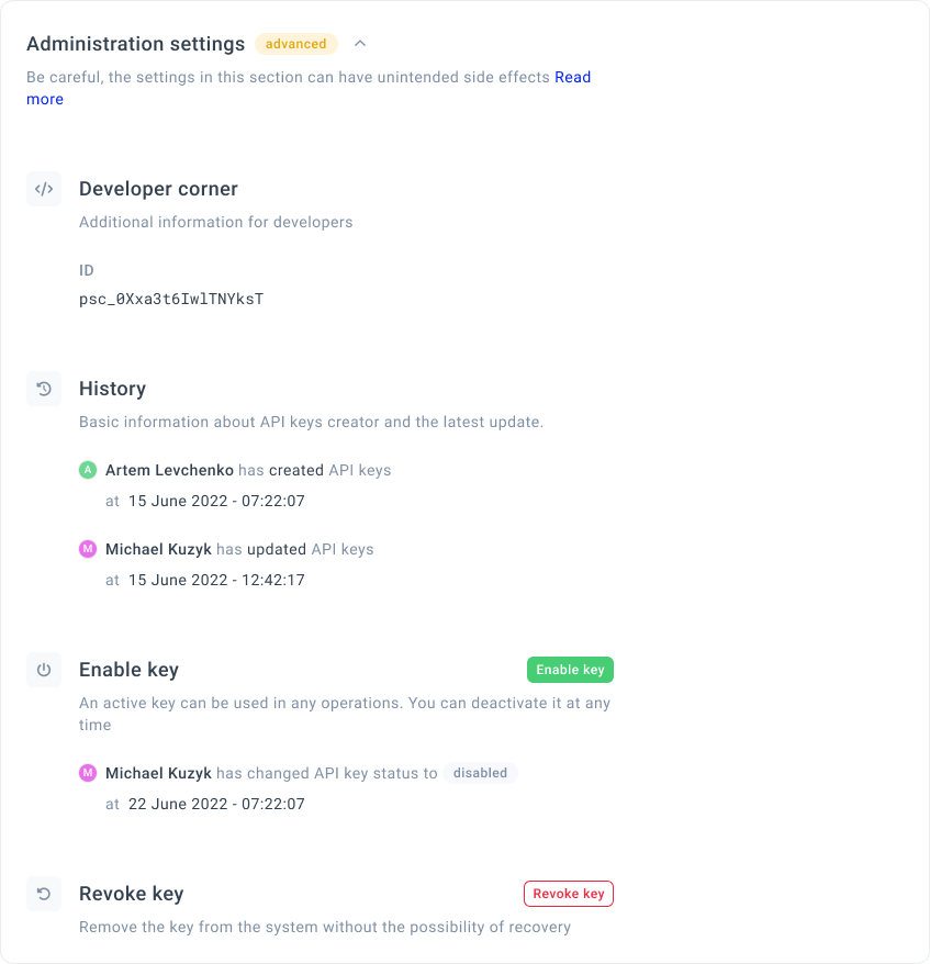 - You can review the Developers corner, which includes the key ID, and the History, which contains basic information about the key creator and the latest update.