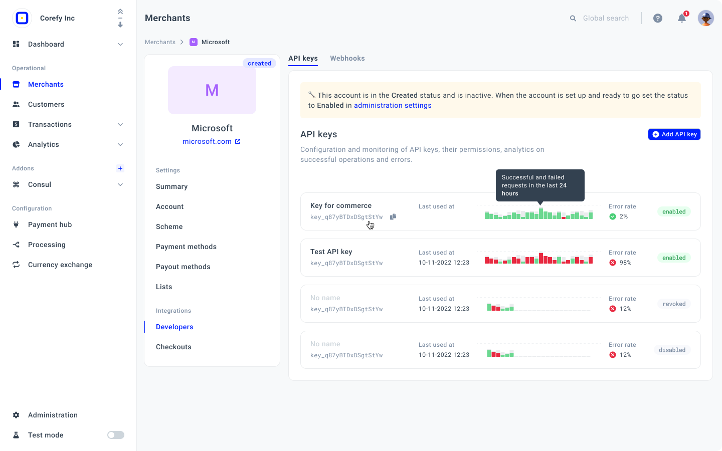 - You can copy the needed key on the grid or review its Error rate. It shows the number of successful and failed requests within the last 24 hours.