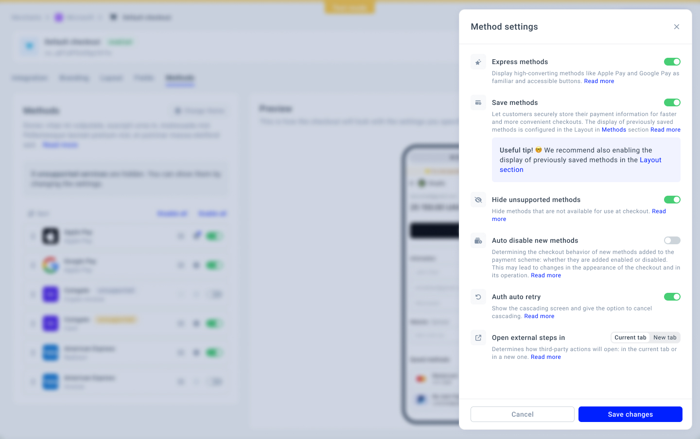 | Auto enable new methods | The option determines the way in which a Checkout should function after adding new Payment methods to the Payment scheme. Be aware that enabling this option may alter the appearance and functional operation of the Checkout. |