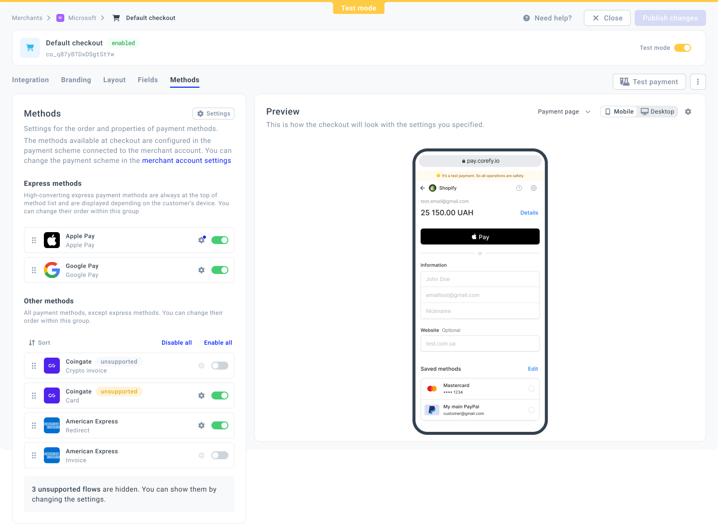 - After you finish updating settings, click Save changes. To review all the established changes, reassess them in a Preview mode. If everything looks as intended, click Publish changes or continue editing the current Version of the given Checkout.