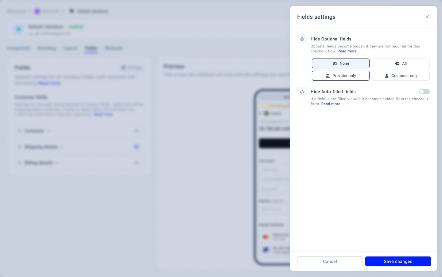 | Provider only | The option hides Payment methods Scheme fields with the Optional validation type from Checkout. |