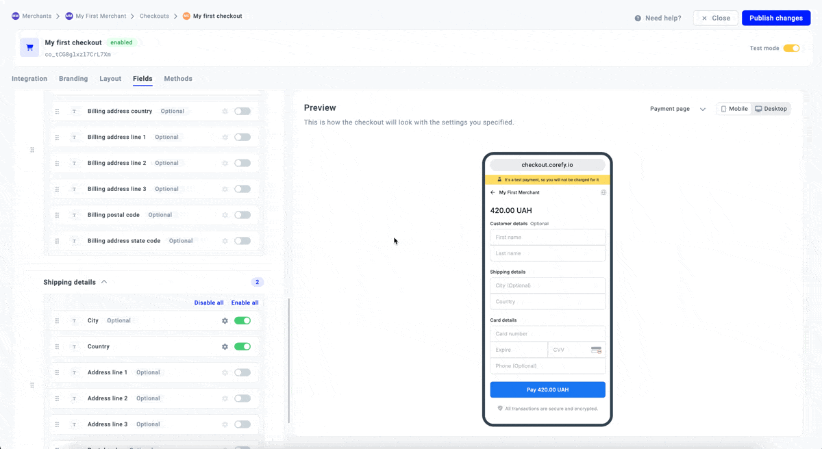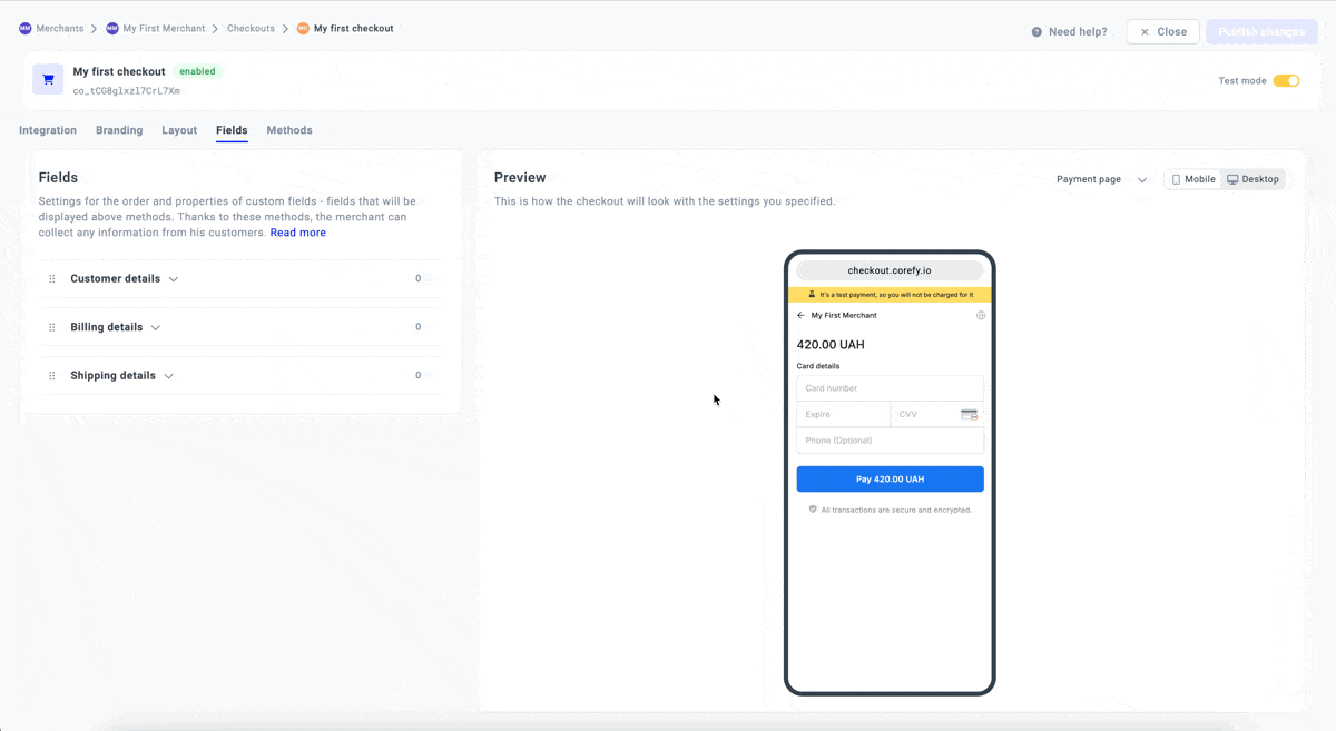 - To review all the established changes, reassess them in a Preview mode. If everything looks as intended, click Publish changes or continue editing the current Version of the given Checkout.