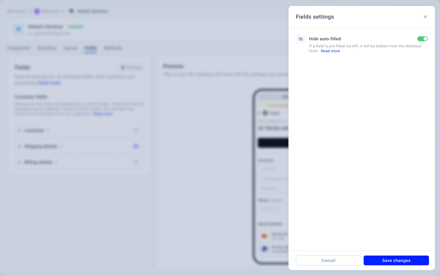 - When this option is enabled and Fields are provided via the API, these fields are not displayed to the Сustomer at Checkout.