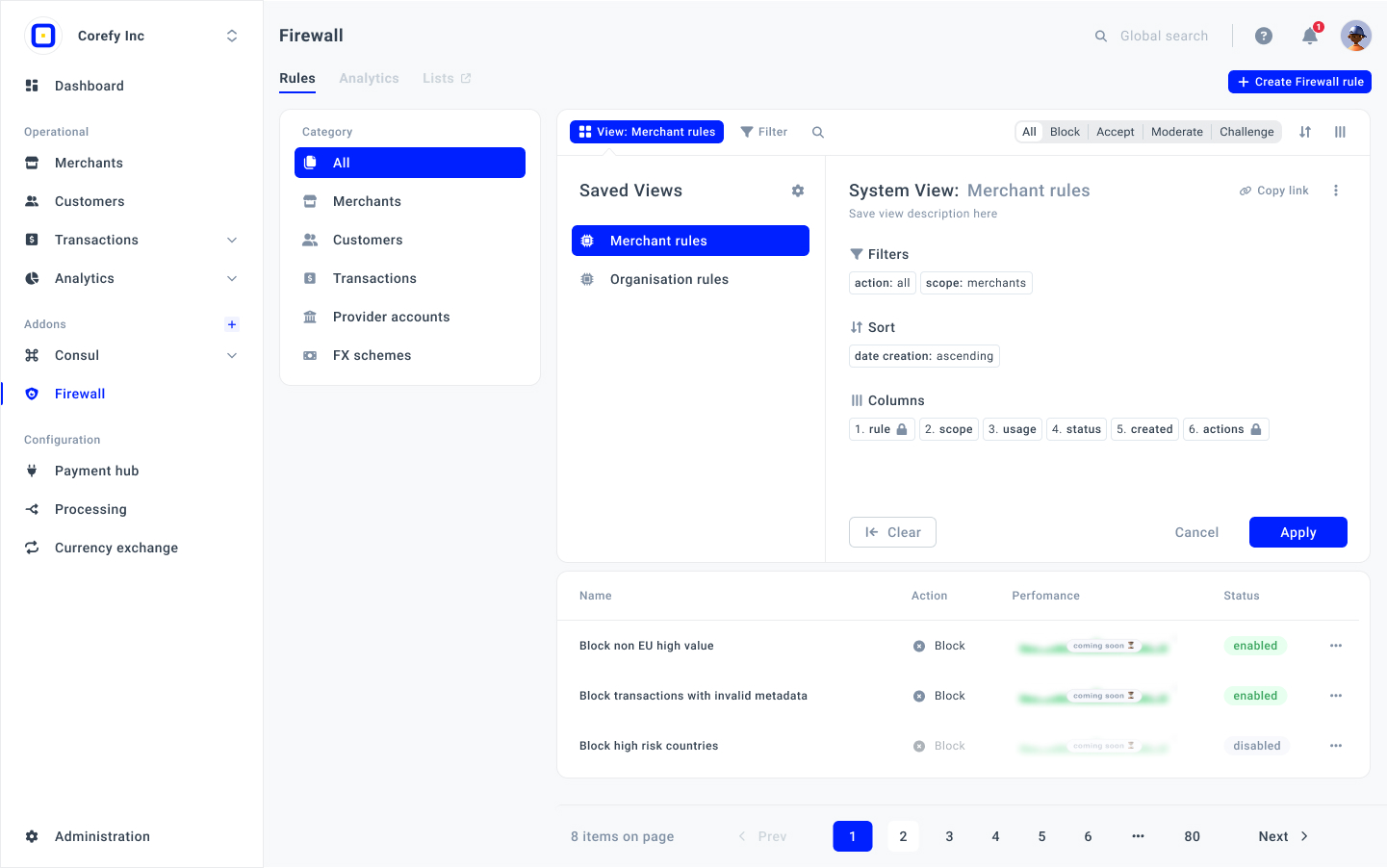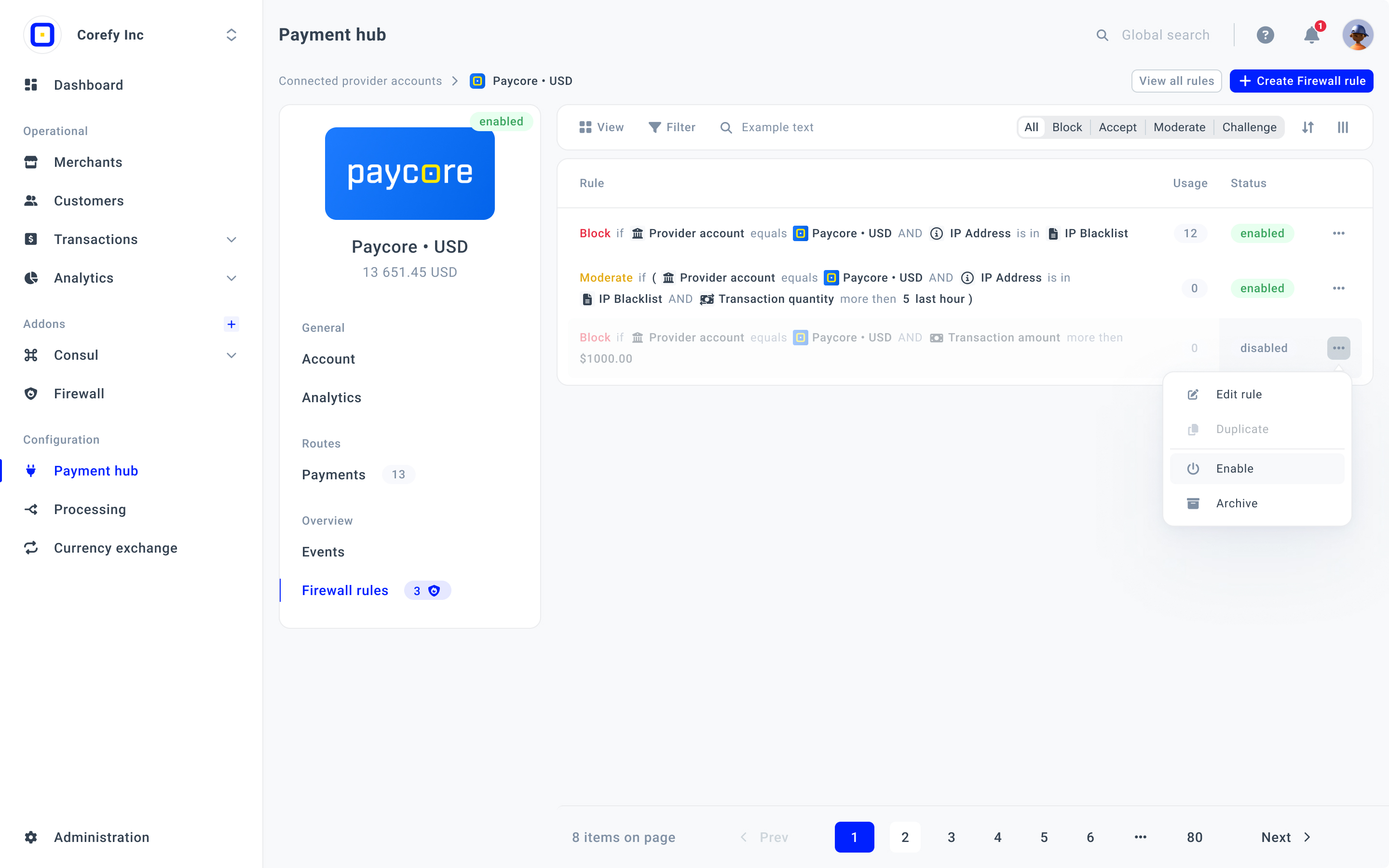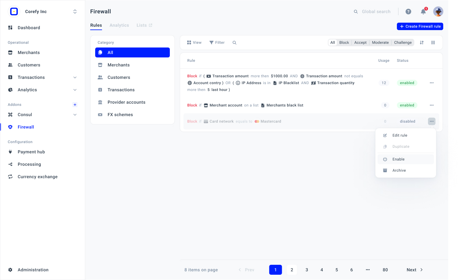 Firewall rules management enables you to implement enhanced security controls within your payment operations. Simple yet practical options to manage the Rules allow you to make the process smoother and adjust the settings to your needs.