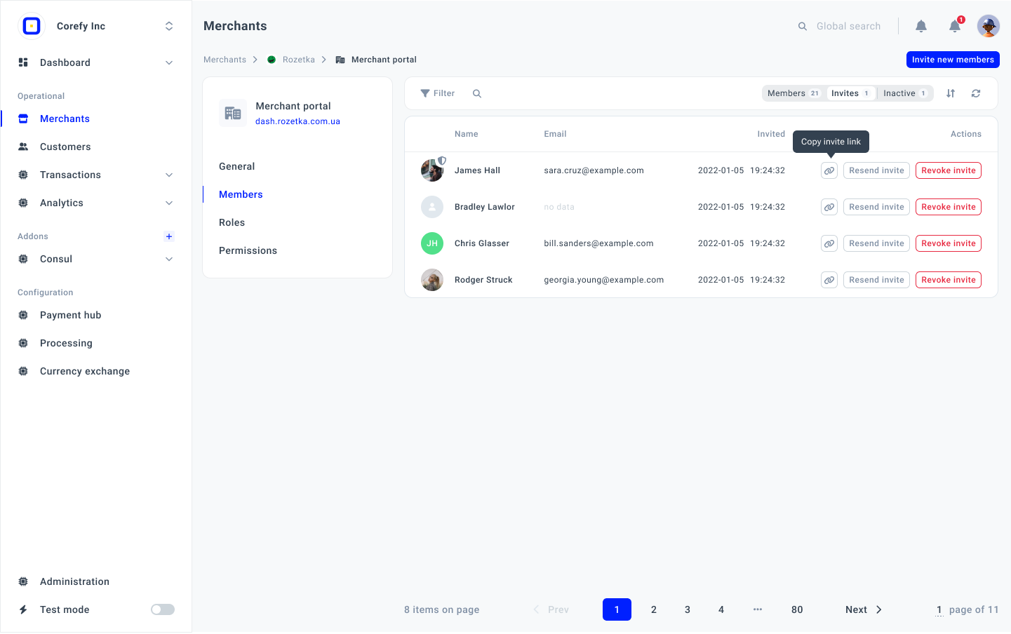 - If you decide that the previously sent Invite is no longer needed, click Revoke invite. After that, the user cannot join the given Merchant account.