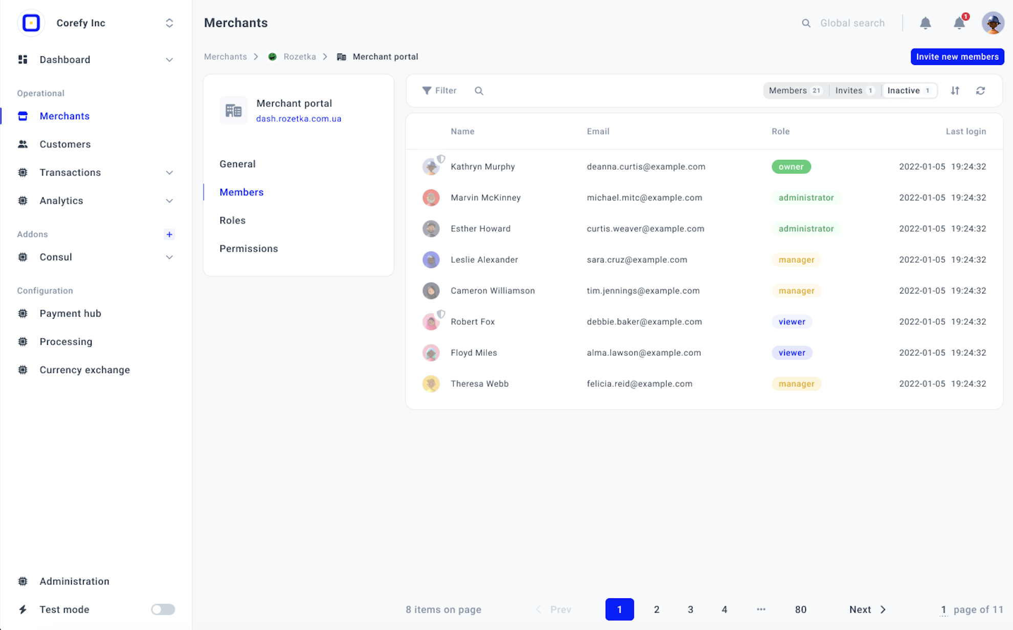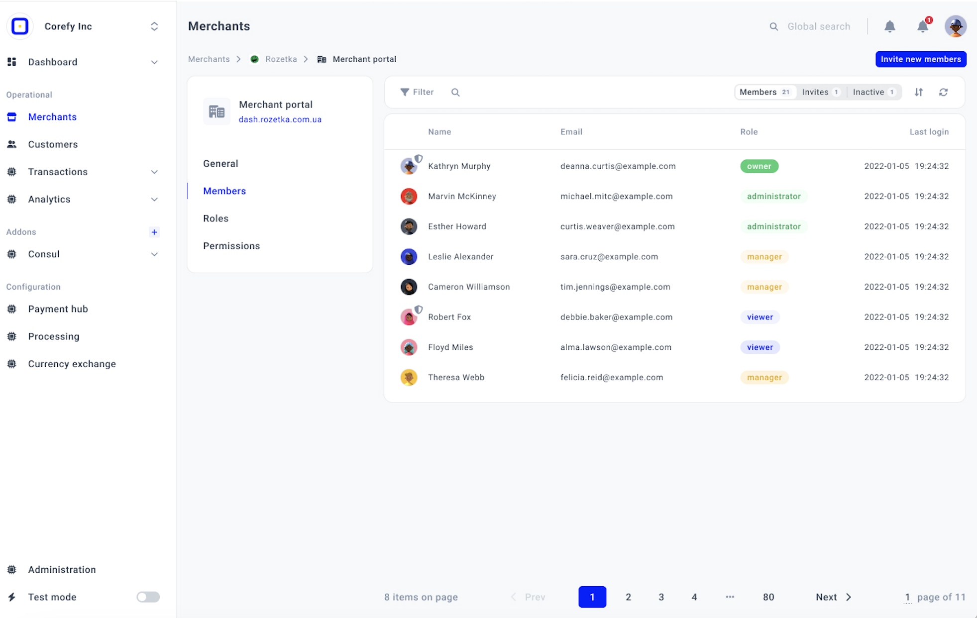 The Members section allows you to manage users of the Merchant account. Here, you can add new Members and track existing ones to control and manage users' data on demand.