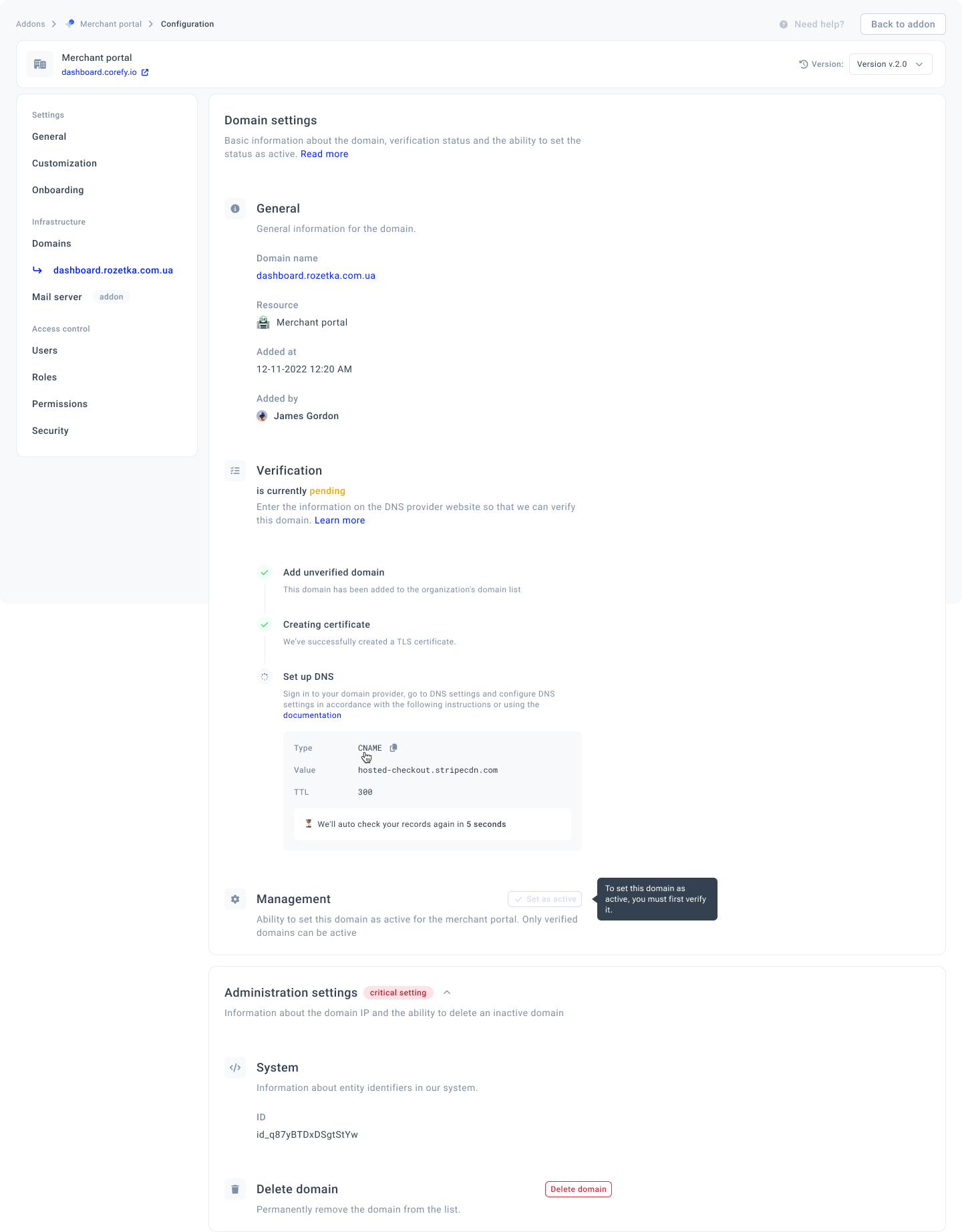 - To make a specific Domain active for a Merchant portal, click Set as active in the Management section.