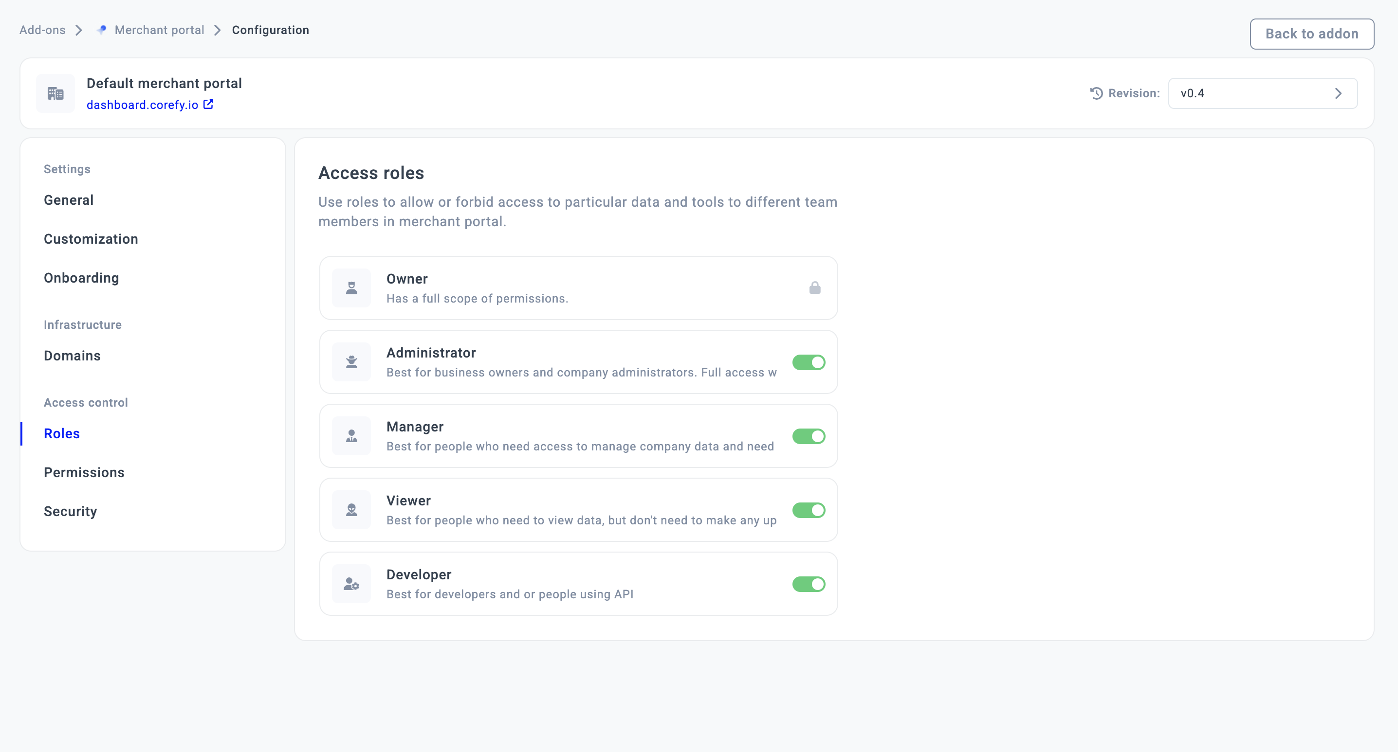 - The Role can be disabled for a specific Merchant on the Dashboard.