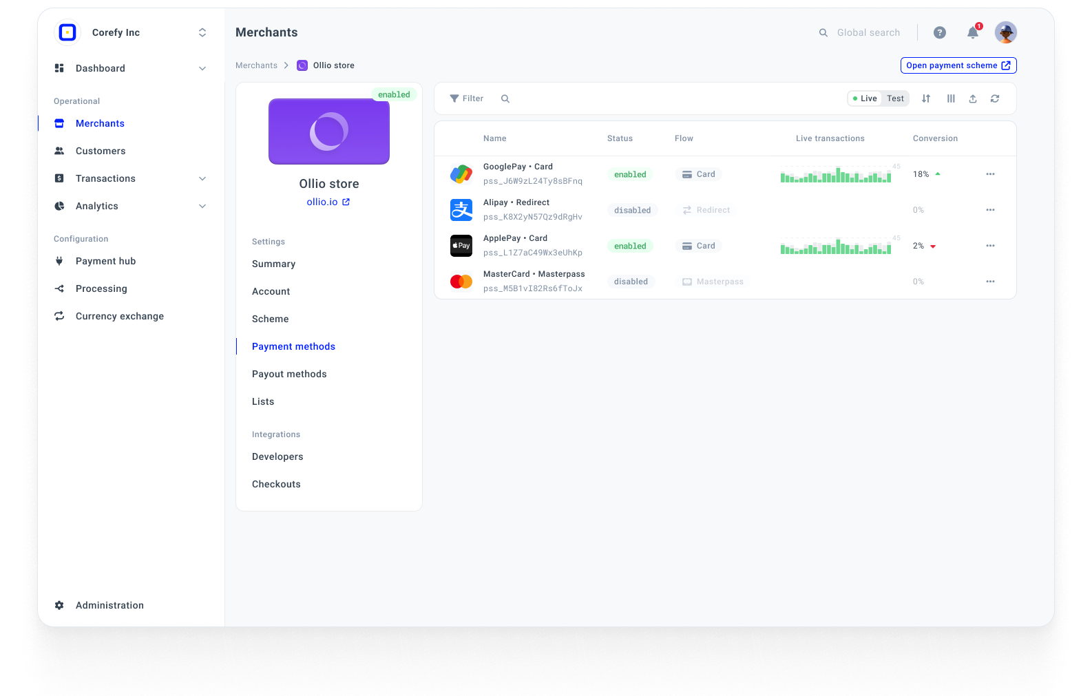- Go to the Scheme tab of the specific Merchant account and ensure Test and Live payments or payouts are enabled.