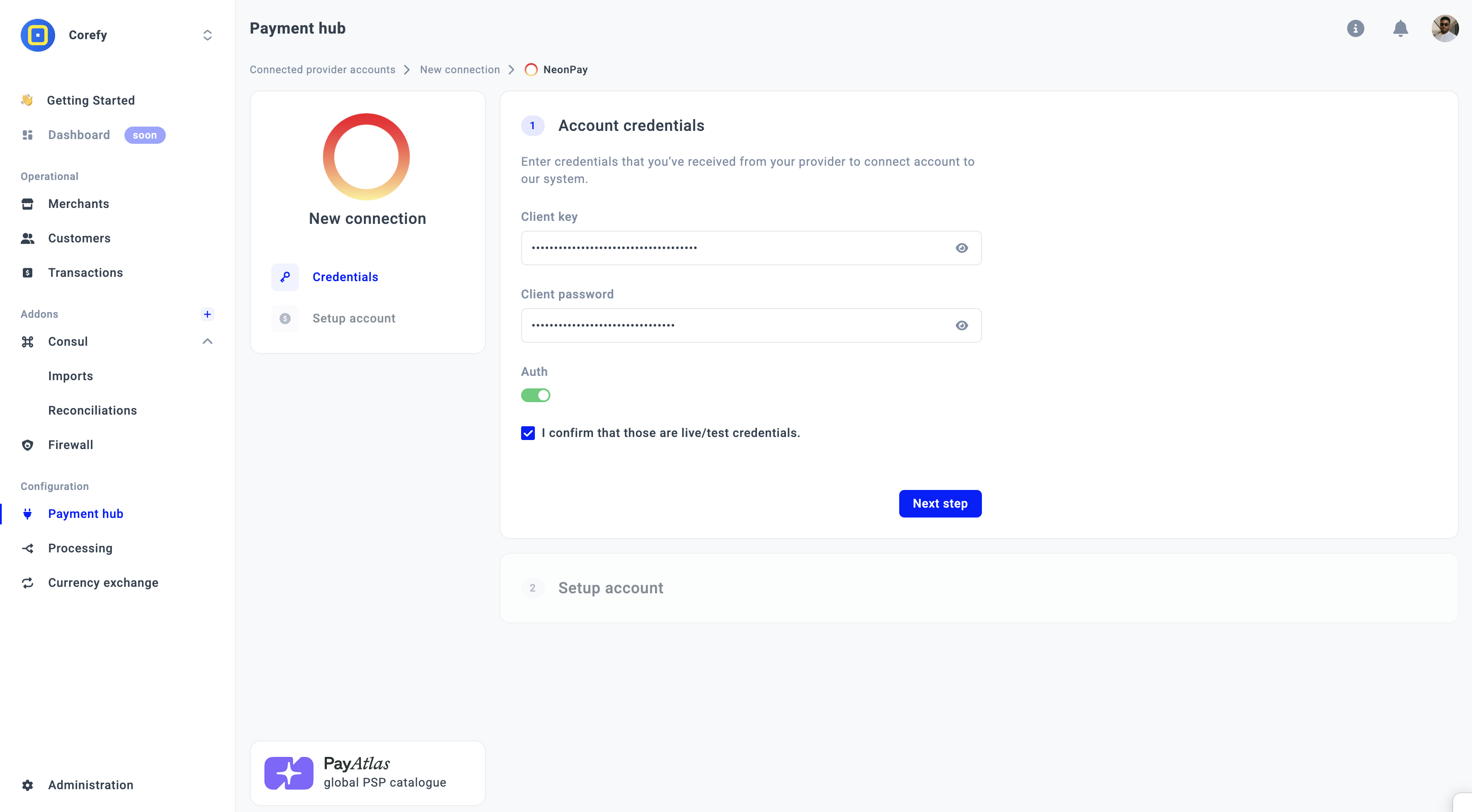 - Click I confirm that those are live/test credentials and move to the Next step.