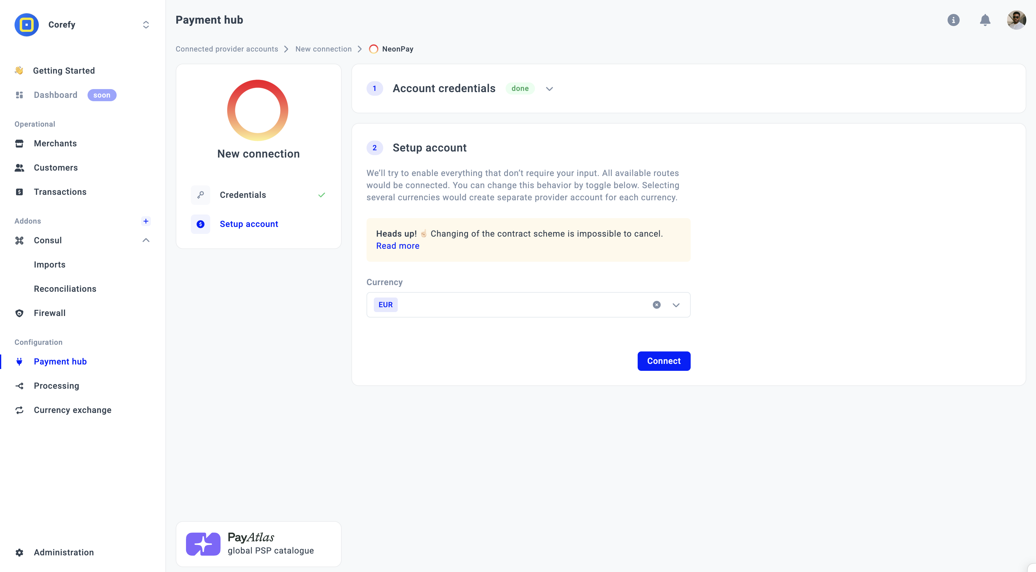 - The system redirects you to the catalogue of available Providers. From the list of Providers, select NeonPay. Click Connect.