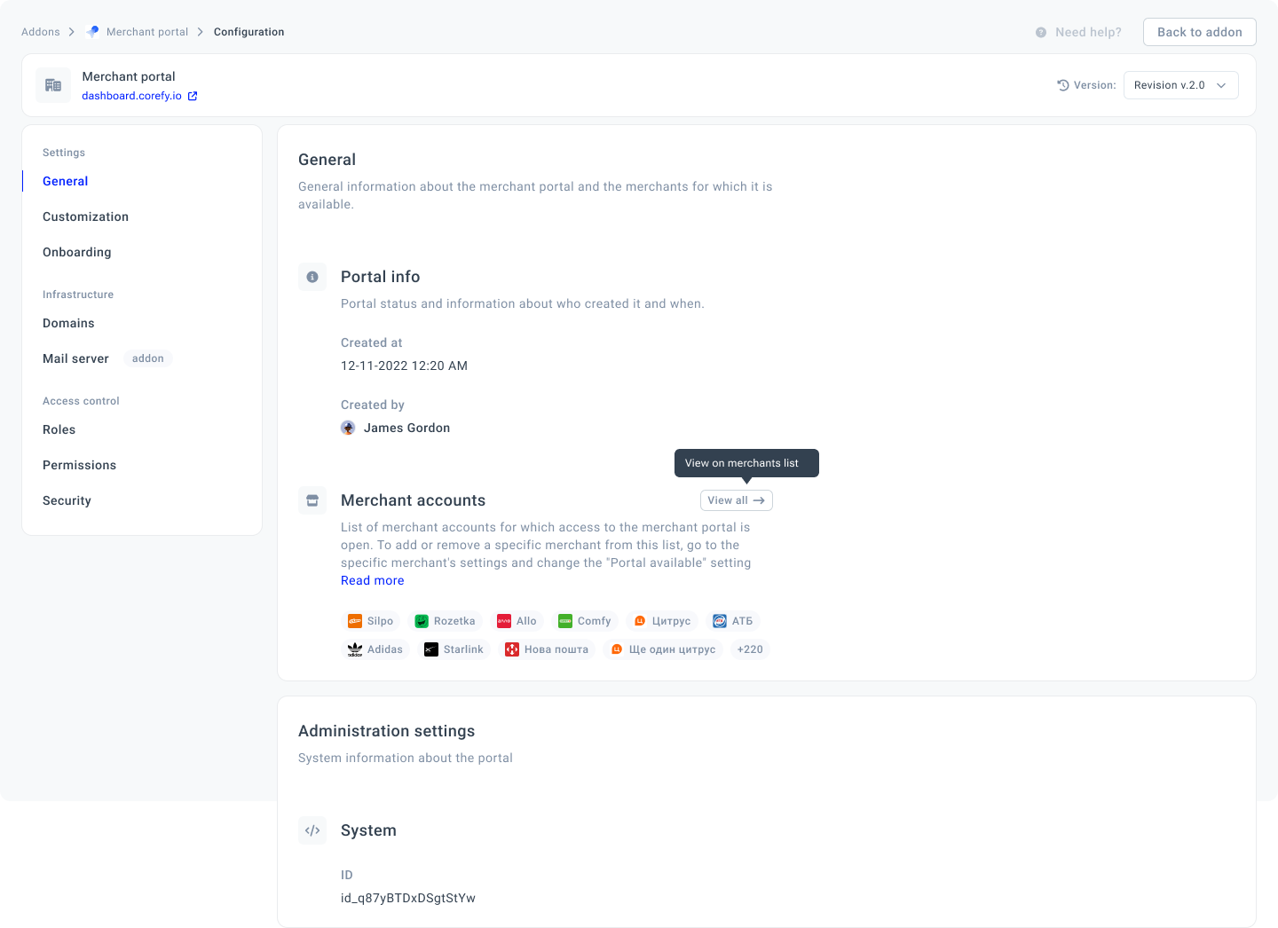 General settings of a Merchant portal add-on include the basic information about the add-on and the added Merchants. It serves as a main overview page that allows you to grasp the needed details and track the connected Merchant accounts based on your current needs.
