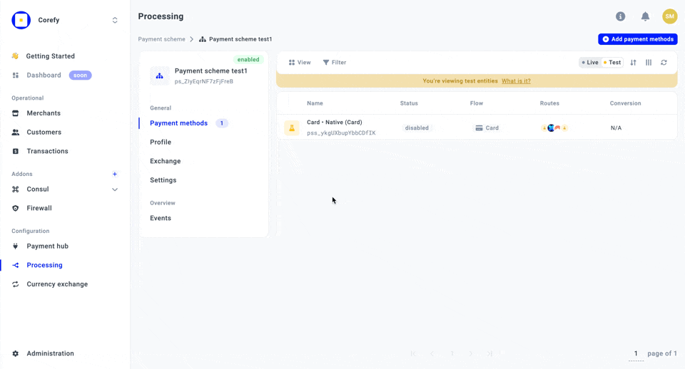 A Payment scheme is an entity that holds the strongest control over the availability of Payment methods and their further visibility. Thus, if you want to have the Payment methods active at the Merchant account level, you need to make sure they are enabled at the Payment scheme level.