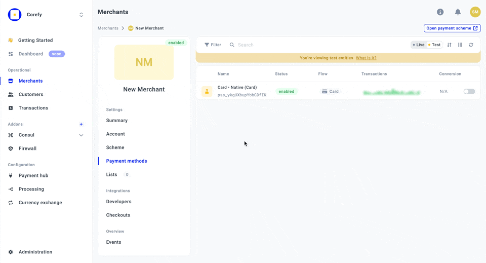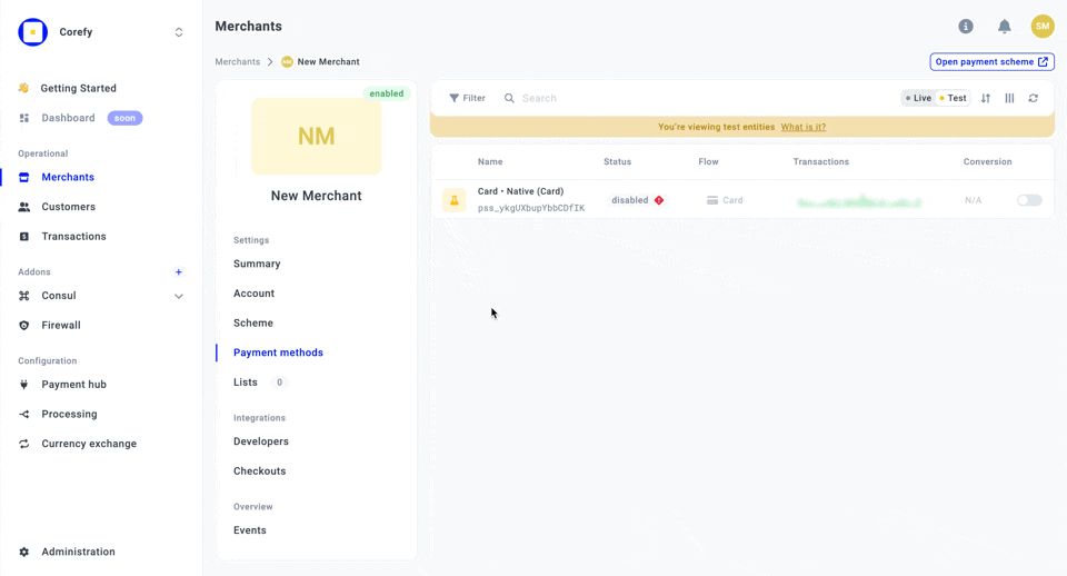 If a specific Method is previously enabled on the Payment scheme, it becomes available at the Merchant account level, and the corresponding toggle is activated. It allows you to switch on/off the Method and work with it further.