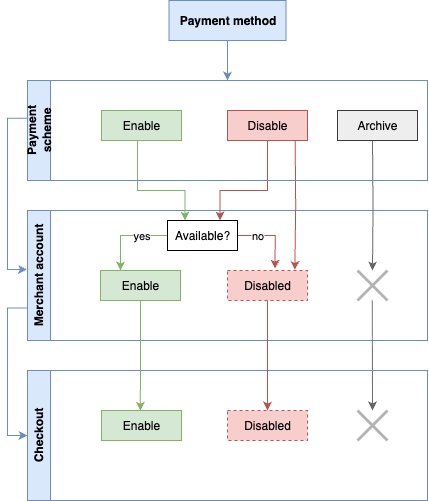 If the Payment method is disabled on a Payment scheme, it becomes disabled in the Merchant accountand at Checkout.