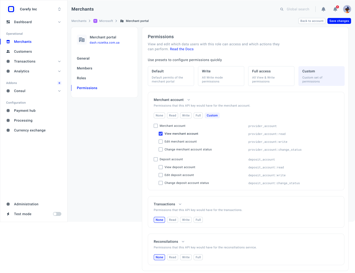 Custom permissions define the alterations that you apply based on your specific business case and the corresponding preferences. Thus, you can execute changes in the scope of Permissions at the Merchant account level. The scope of pre-determined Permissions comes from the Merchant portal and the activated MP Version.
