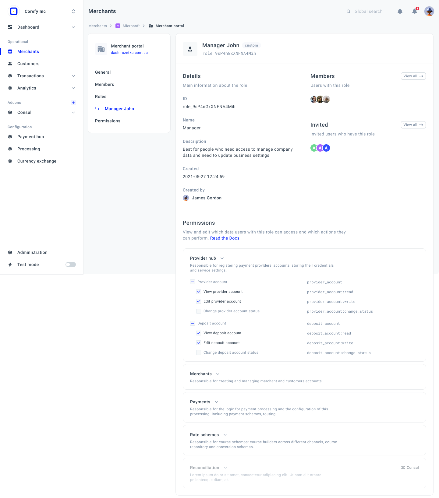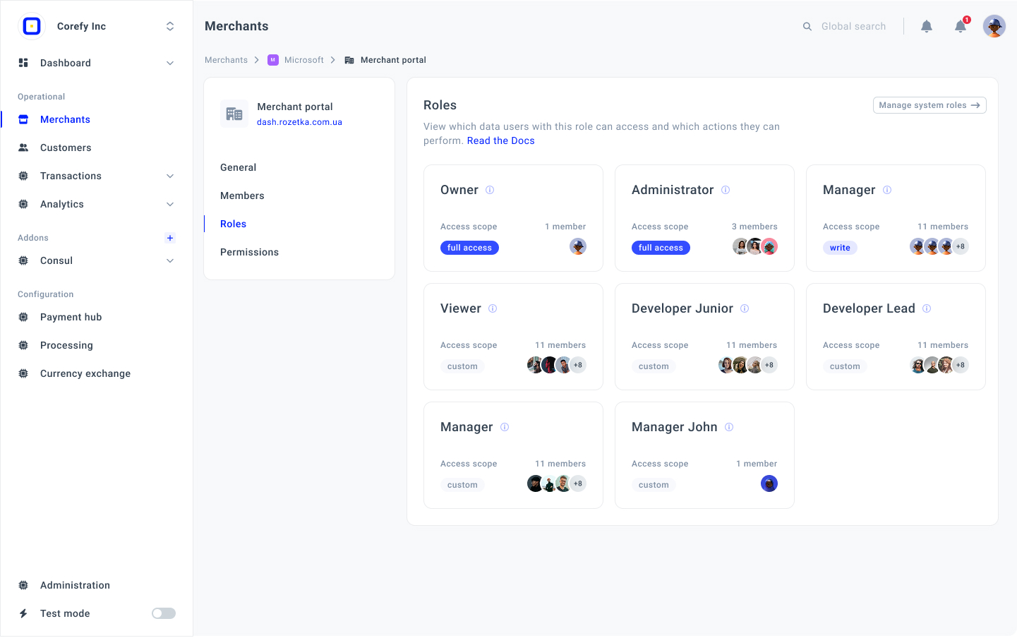 - To manage the Roles, click Manage System roles. The system redirects you to the Merchant portal roles. To learn more, go to the Manage Roles guide.