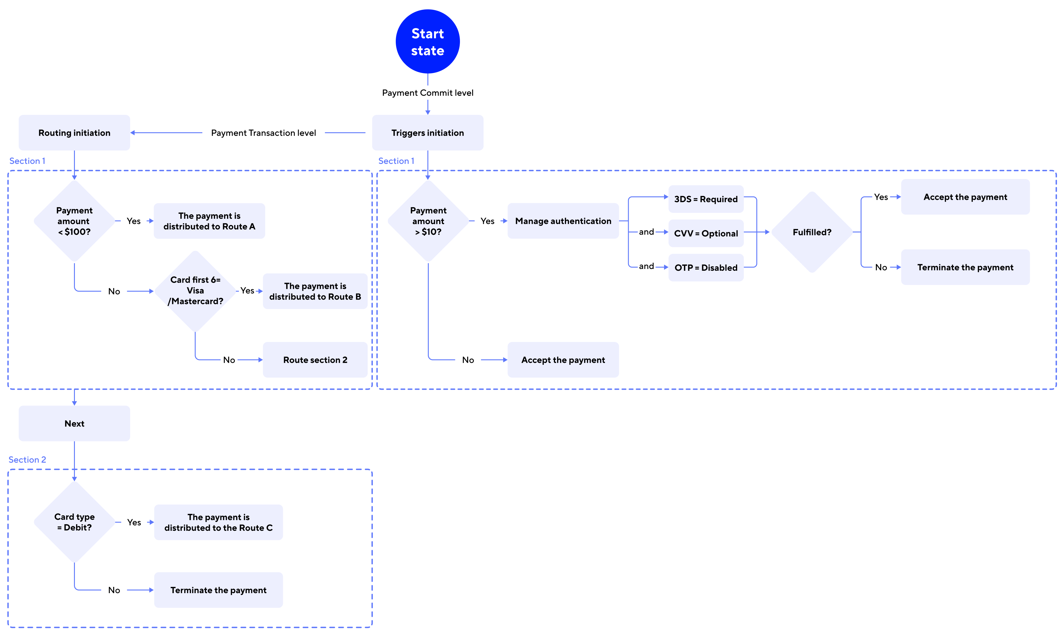 The simple case study can help you dive deeper into the Routing process and get familiar with Rules and Conditions establishment in a broader sense. Thus, look at the scheme and its description below to learn the real-life representation of the complex yet well-built payment workflow.