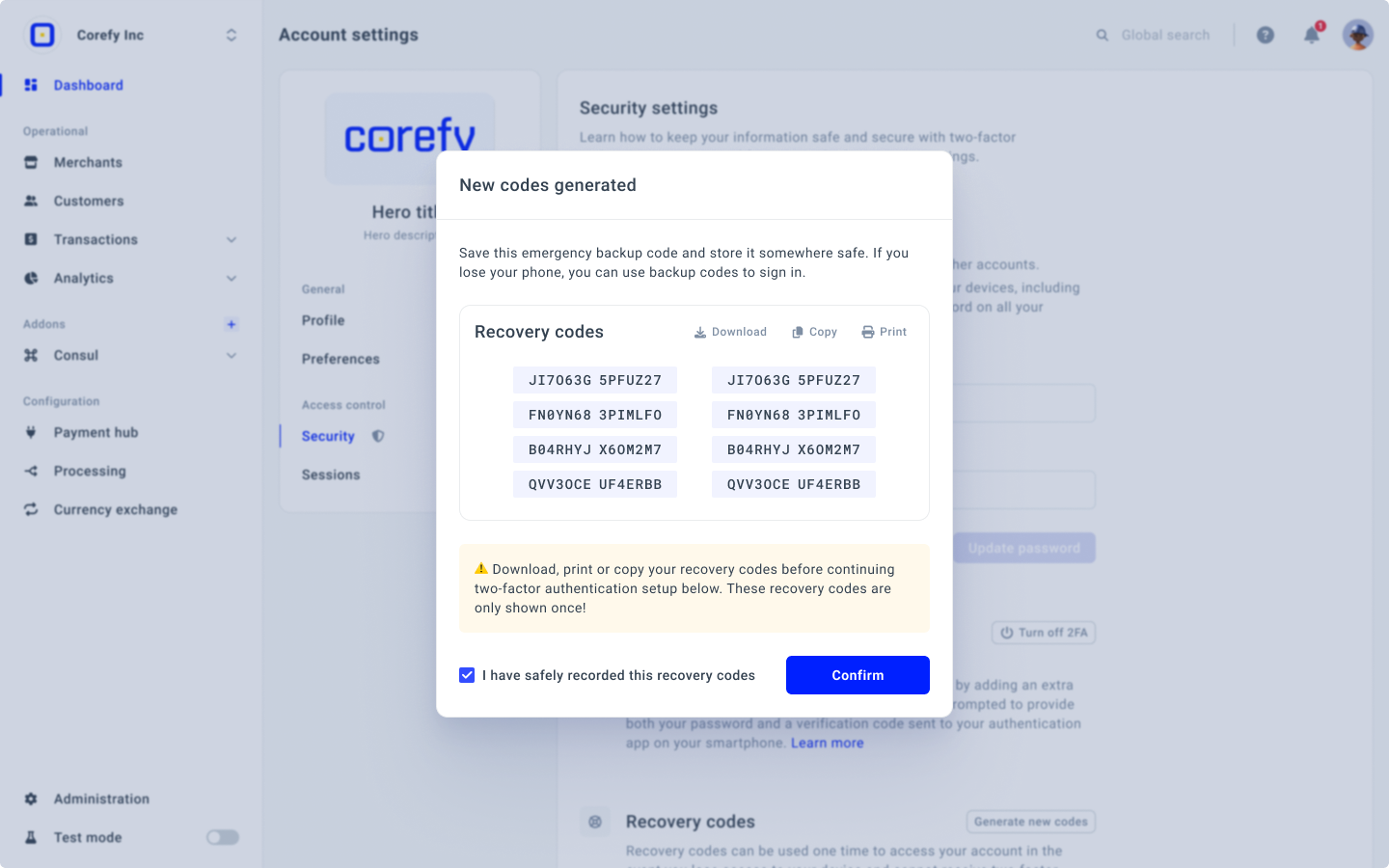This section is located right under the Two-Factor authentication section and is only visible if you have 2F enabled on your Account. You need to enter the verification code from the authentication app on your device. After that, you receive the list of ten new codes. Download, print, or copy them before you continue working with the system.