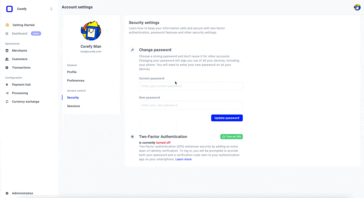 If you decide to change your password, click the Profile icon in the top right corner and go to Account Settings. Enter your old password, then choose the new one. Remember, it should be longer than eight characters and contain at least one uppercase letter, one number, and one special character. If you have a 2F authentication enabled on your Account, you need to use the verification code from your device after you click Update password.